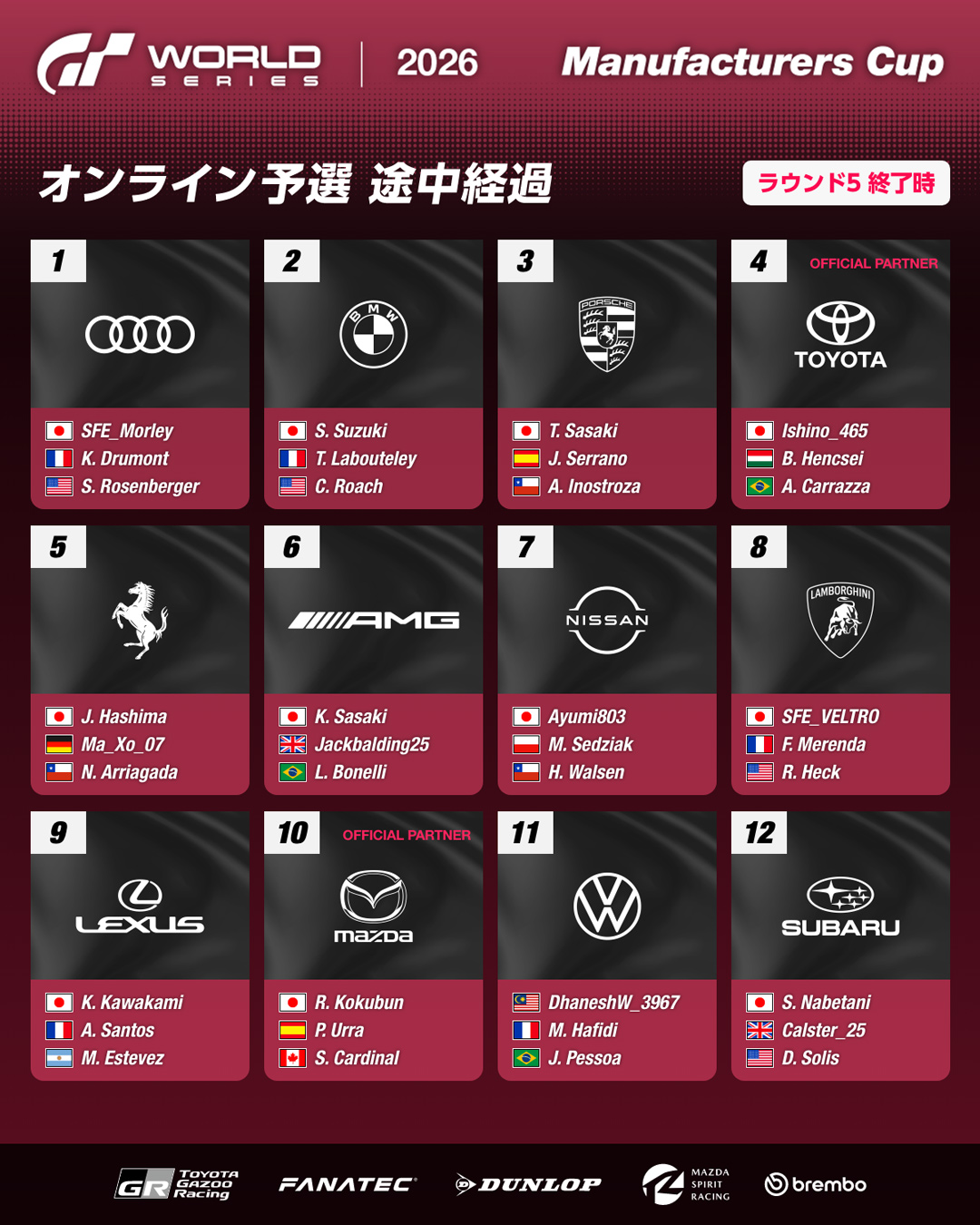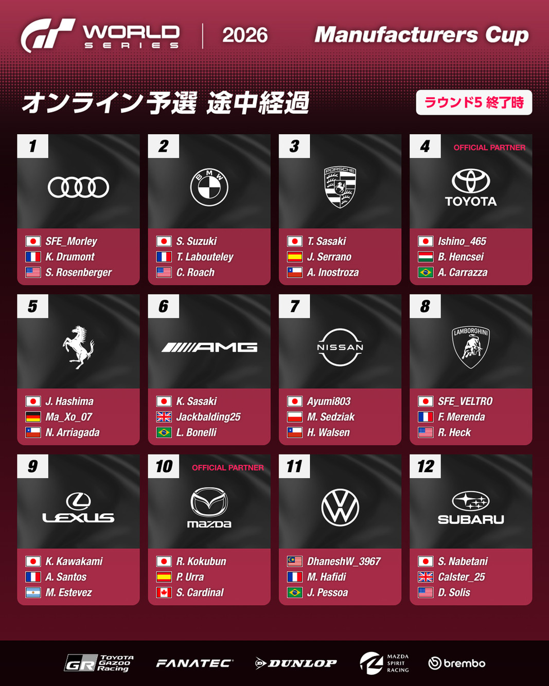 1月28日(水)、「グランツーリスモ ワールドシリーズ 2026 オンライン予選 - マニュファクチャラーズカップ」のラウンド5が終了しました。現時点での上位12マニュファクチャラーおよびプレイヤーのランキングは以下のとおりです。