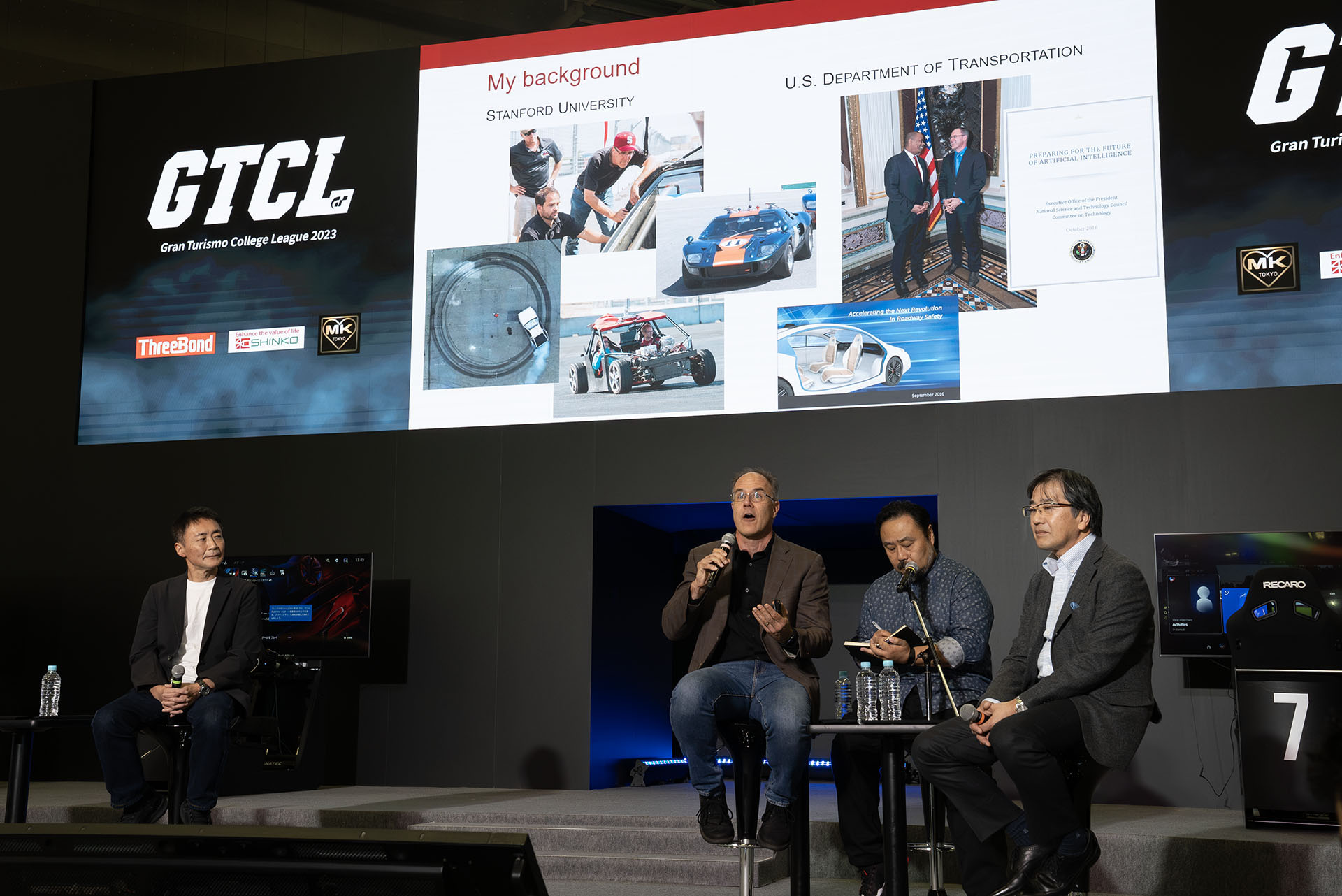 本大会では「自動運転の社会実装に向けて」をテーマとした有識者によるトークショーも開催。内閣府プロジェクト「SIP自動運転」プログラムディレクターの葛巻 清吾氏、スタンフォード大学よりクリス・ゲルデス教授、「グランツーリスモ」シリーズ プロデューサー山内 一典を交えたパネルトークも行われました。
