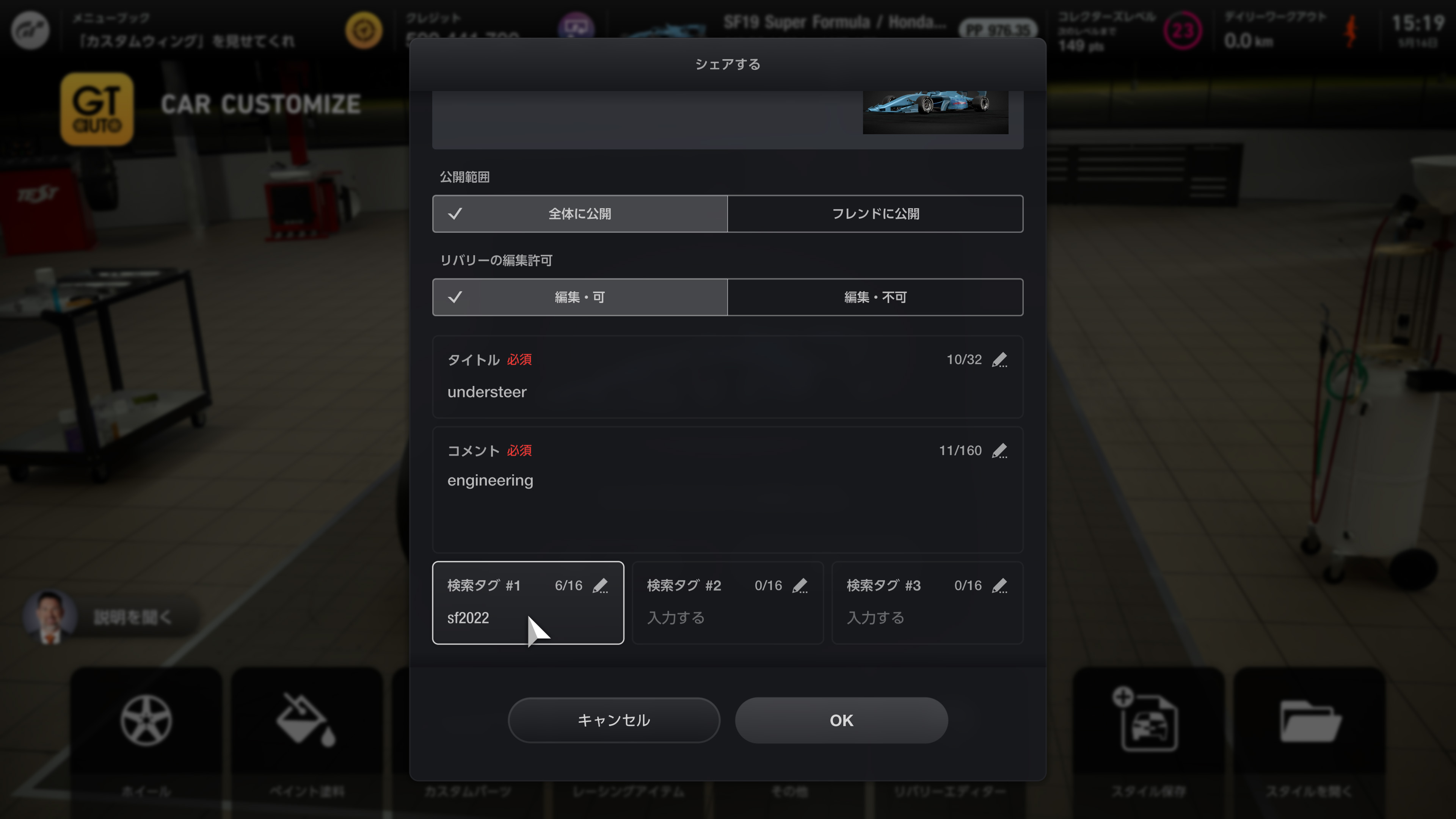 『グランツーリスモ7』ゲーム内で、スーパーフォーミュラ ダラーラ SF19 Super Formula / Toyota '19およびスーパーフォーミュラ ダラーラ SF19 Super Formula / Honda '19車両をベースに、SUPER FORMULA 2022年シーズンに参戦しているマシンおよびSUPER FORMULA NEXT50開発テストカーの各23台のリバリーを精巧に再現した作品(スタイル)を [リバリーエディター] で作成し、公開範囲を [全体に公開] に設定して、指定の2つの検索タグ、#sf2022 #カーナンバー(※作成した車のカーナンバー数字のみを記載)を記入、 [ショーケース] にシェアをしてください。シェアした作品(スタイル)のURLを公式サイト「グランツーリスモ・ドットコム」の 「GT7マイページ」から、ご自身のTwitterアカウントで、指定の4つのハッシュタグ、#sf2022 #カーナンバー(※作成した車のカーナンバー数字のみを記載) #SFormula #SFNEXT50 を添えて、投稿をすると応募完了です。