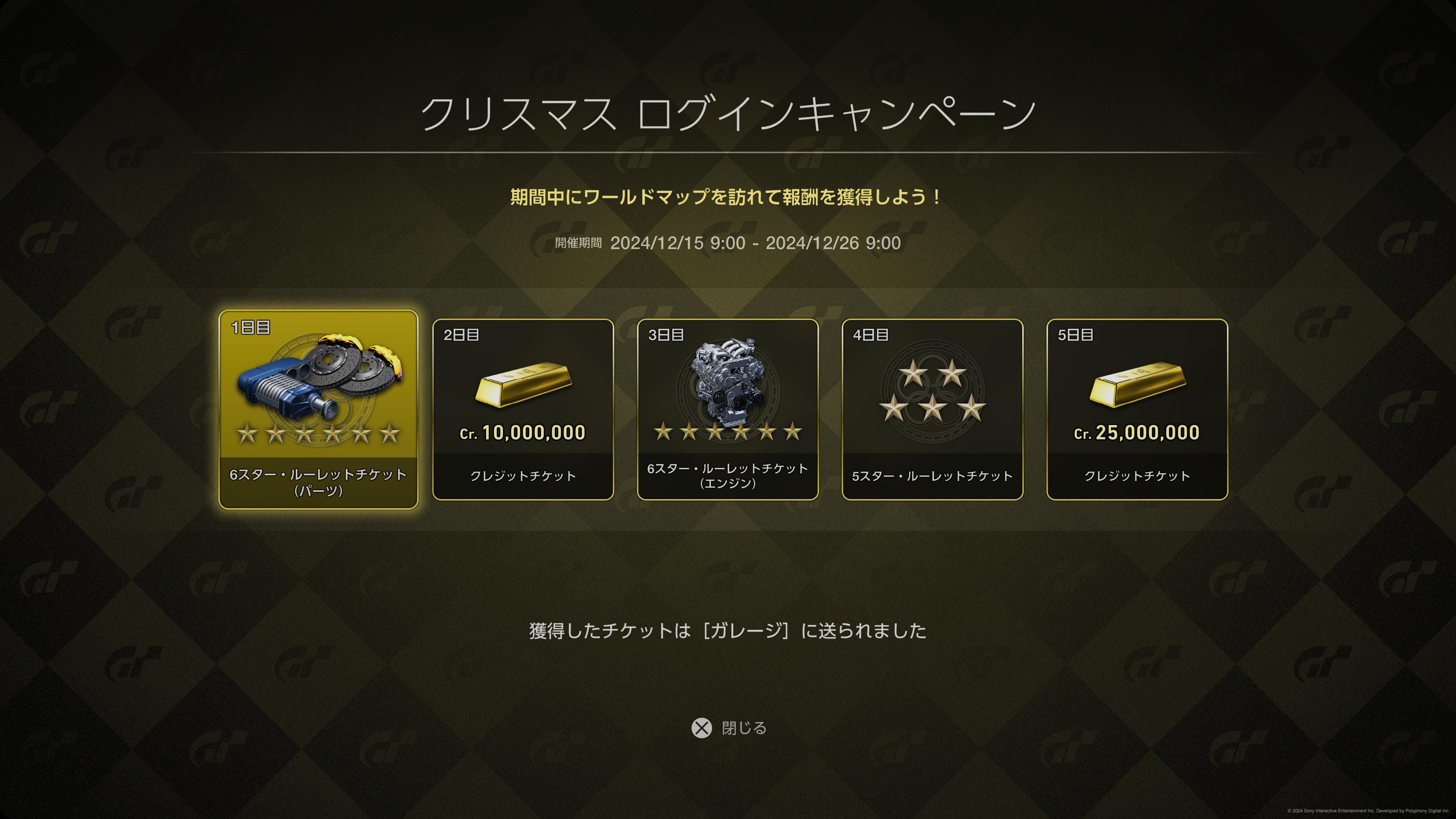 各キャンペーンは、開催期間中に『グランツーリスモ7』を起動し、ワールドマップを訪れることで1日につき1回ギフトを受け取ることができます。ギフトは訪れる日数によって種類が異なるチケットが設定されており、最大で5日間分のチケットを獲得することができます。