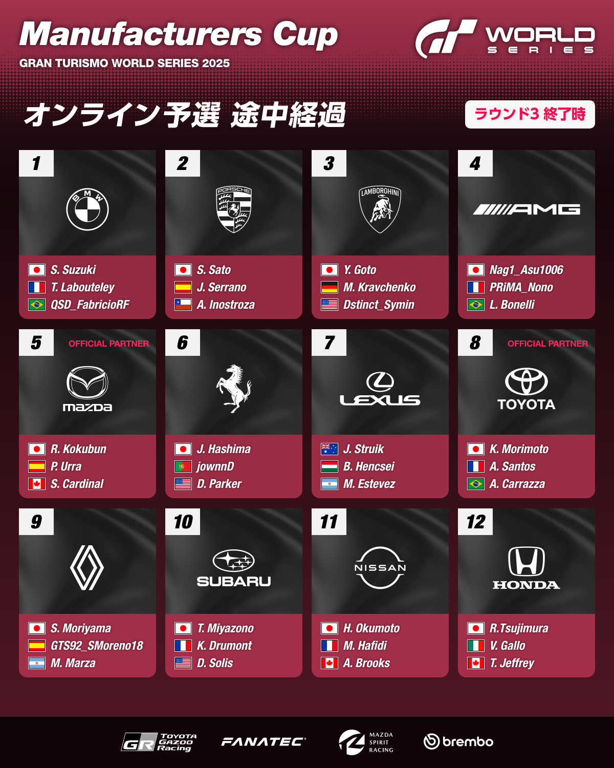 4月9日(水)、「グランツーリスモ ワールドシリーズ 2025 オンライン予選 - マニュファクチャラーズカップ」のラウンド3が終了しました。現時点での上位12マニュファクチャラーおよびプレイヤーのランキングは以下のとおりです。
