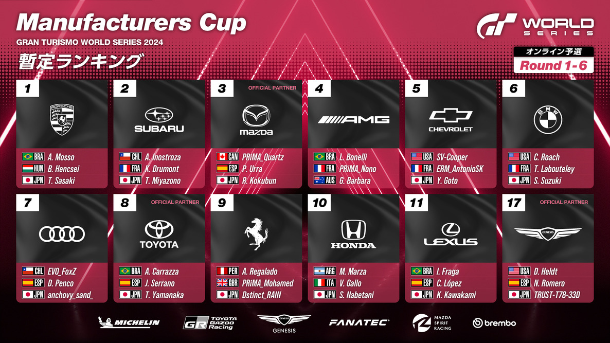 「グランツーリスモ ワールドシリーズ 2024 オンライン予選 - マニュファクチャラーズカップ」全ラウンドが終了。本戦出場権を獲得した12マニュファクチャラーを発表!