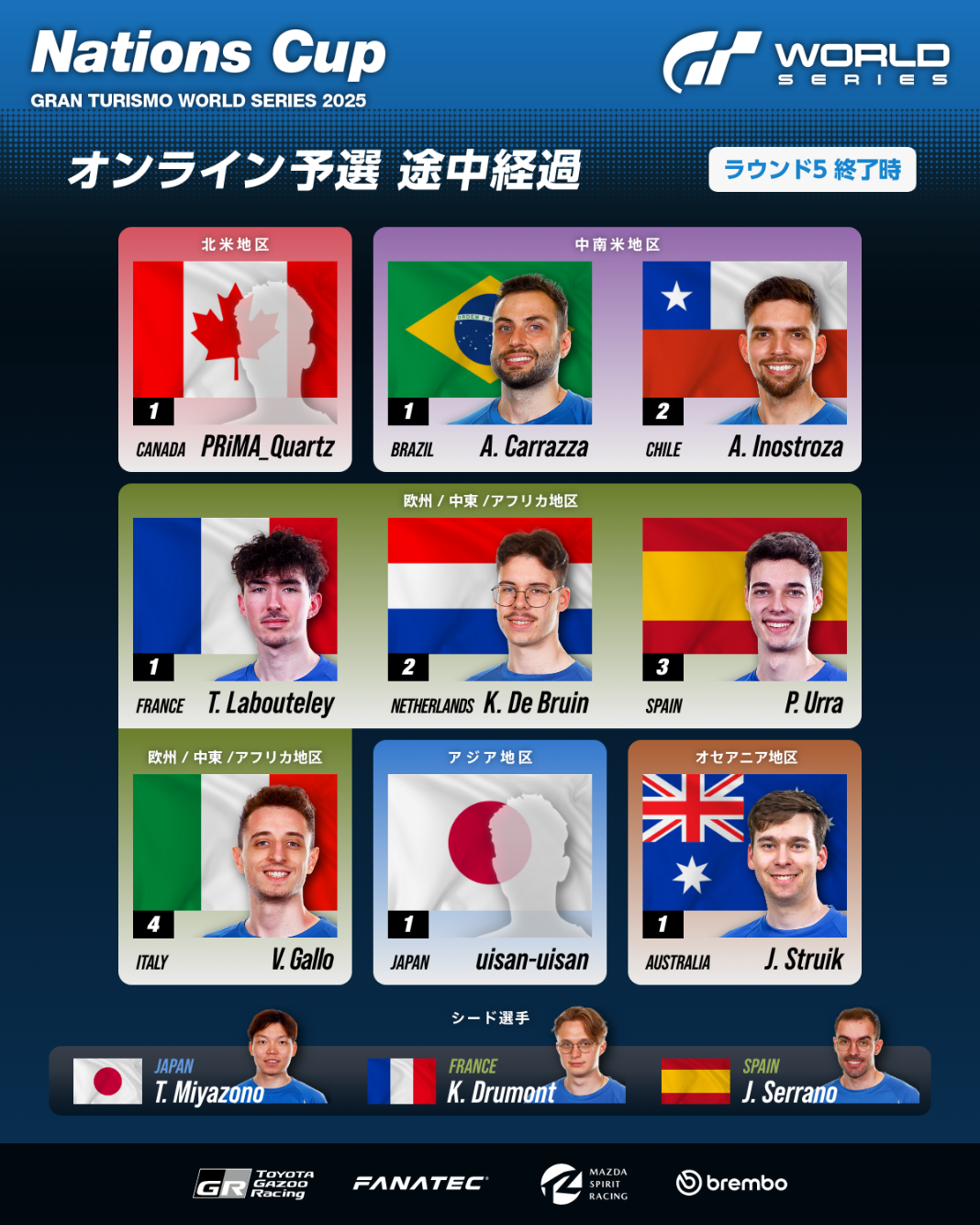 5月7日、「グランツーリスモ ワールドシリーズ 2025 オンライン予選 - ネイションズカップ」のラウンド5が終了しました。現時点でのオンライン予選、成績上位の国・地域およびプレイヤーは以下のとおりです。