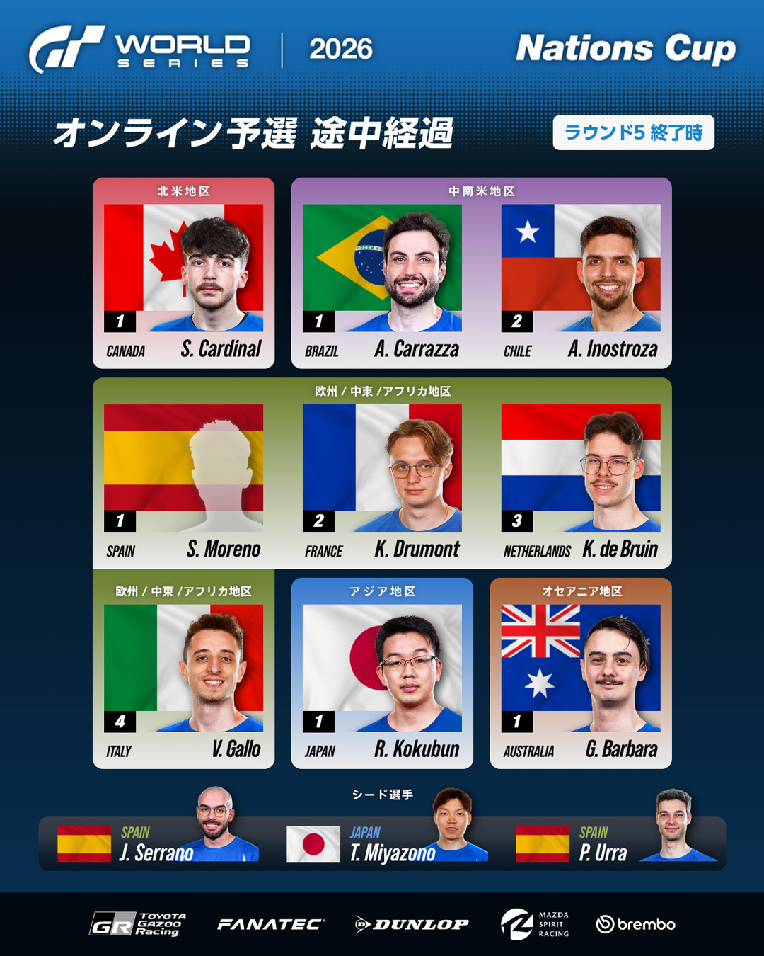 2月25日、「グランツーリスモ ワールドシリーズ 2026 オンライン予選 - ネイションズカップ」のラウンド5が終了しました。現時点でのオンライン予選、成績上位の国・地域およびプレイヤーは以下のとおりです。