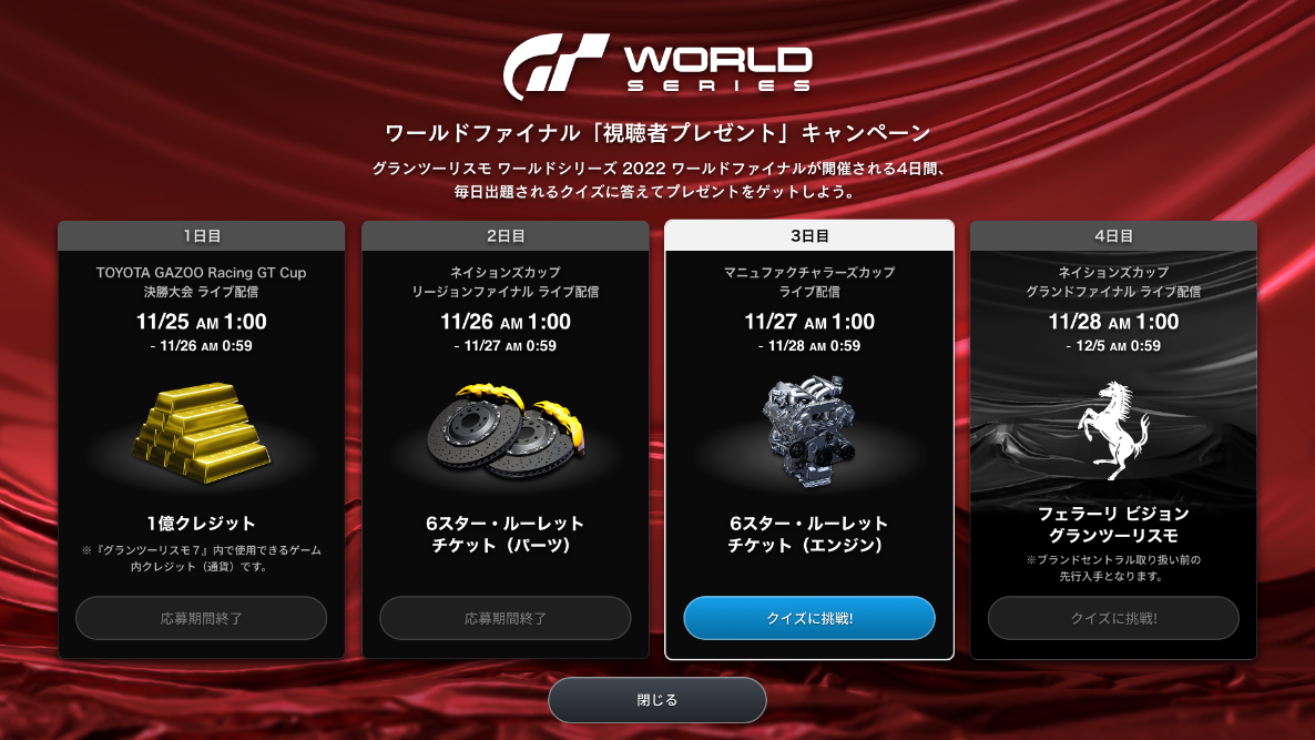 ■ワールドファイナルを観て『フェラーリ ビジョン グランツーリスモ』を先行入手しよう!4日間限定の日替わりプレゼントキャンペーン実施!