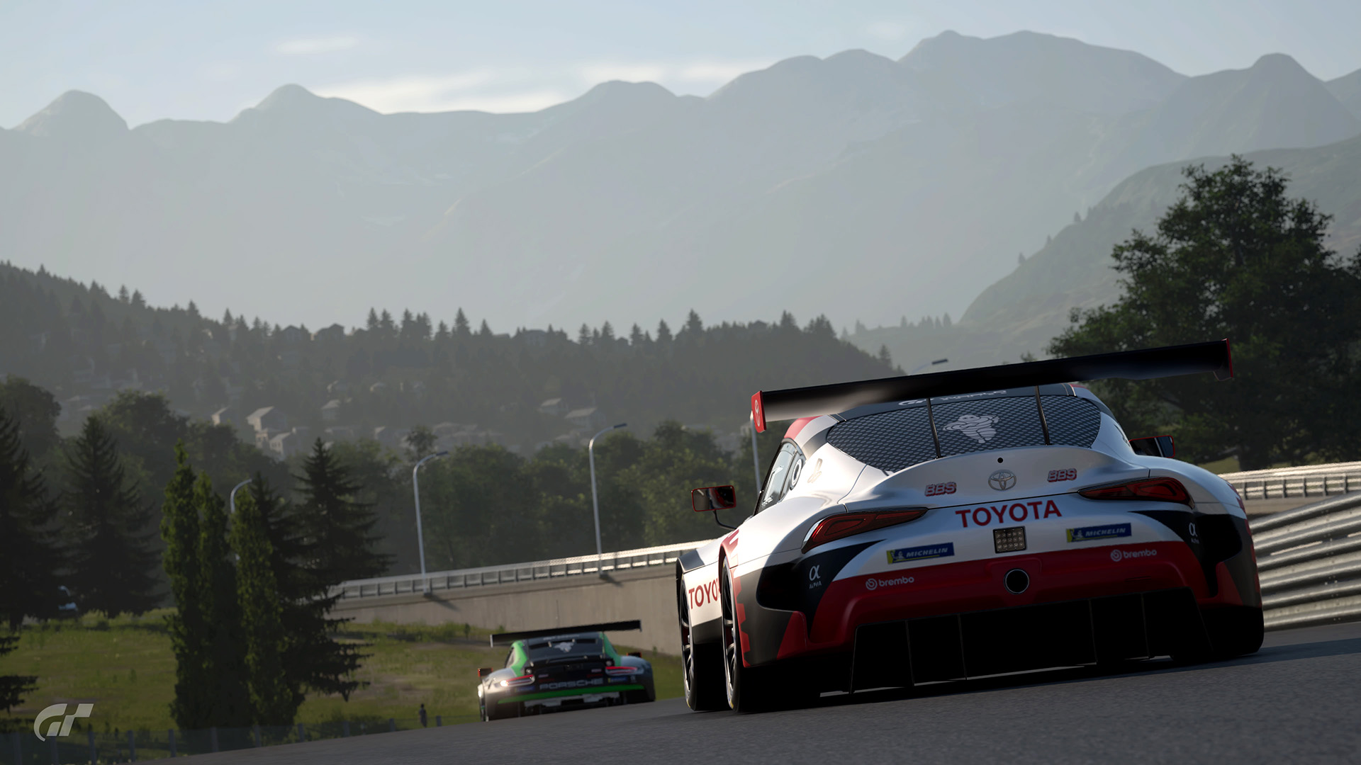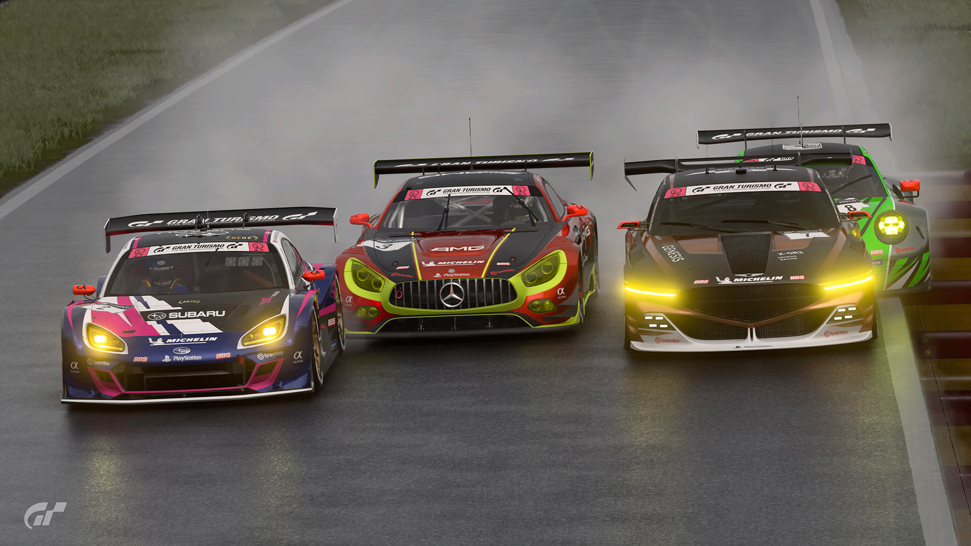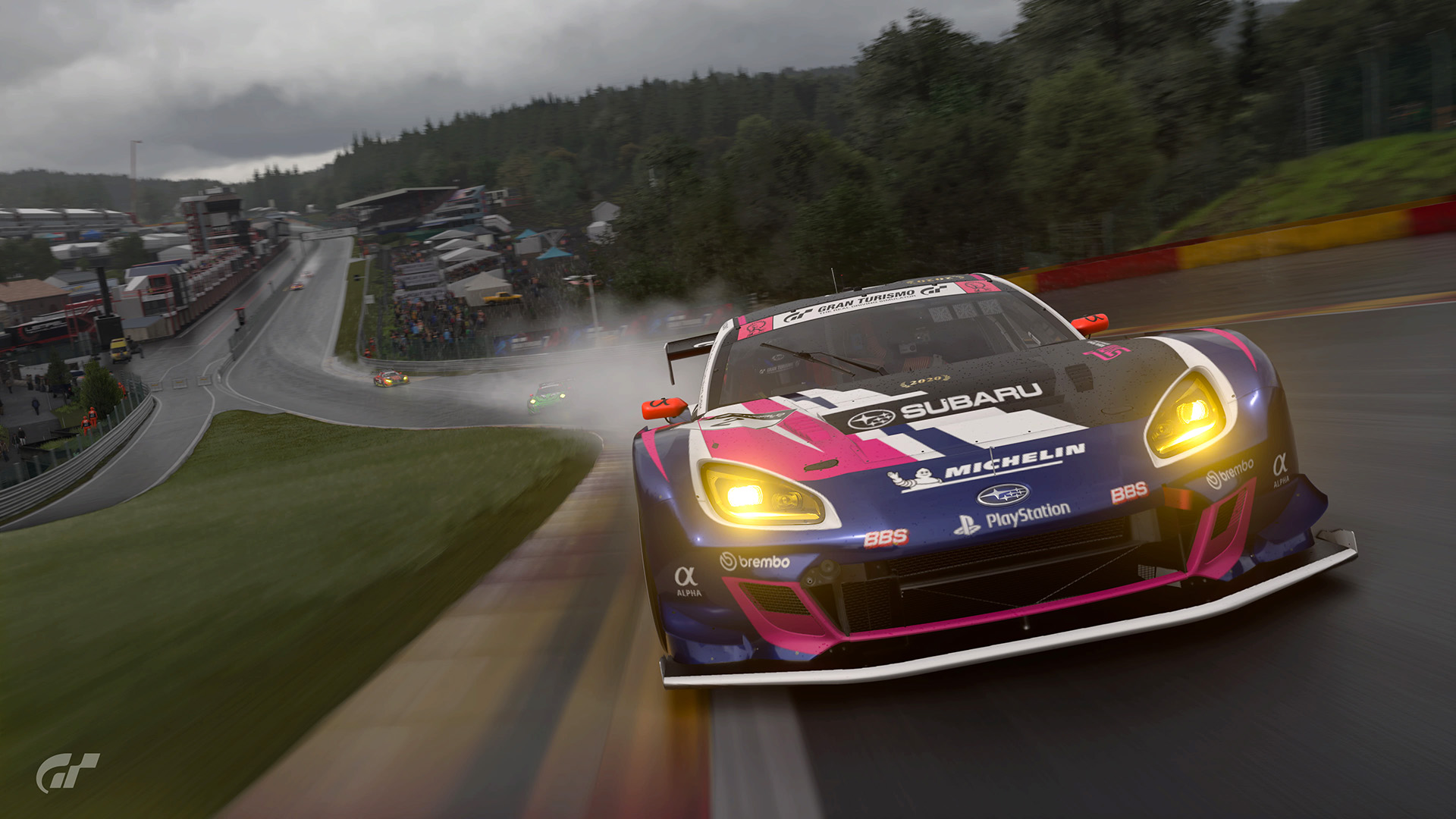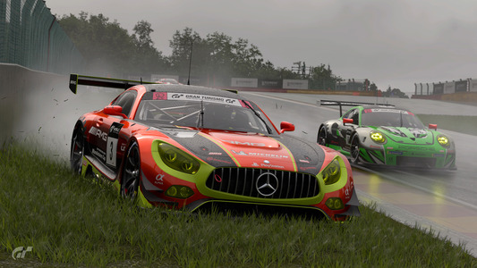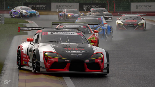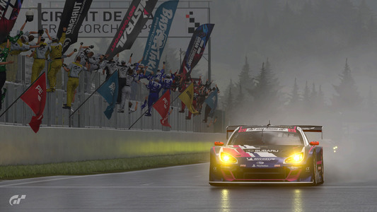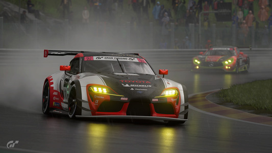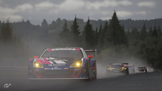 2ラップ目には早くもトヨタの作戦が裏目に出ました。予想していた激しい雨は降らず、フラガのトヨタ GRスープラは他のクルマに対して速度が低下。この時点で、ポルシェ 911 RSR (991)はトヨタに2.0秒ものリードを広げ、メルセデスAMGは3位を維持。メルセデス AMG GT3は3ラップ目にスープラを追い抜きます。ソリスがハンドルを握る5番手スタートのスバル BRZ GT300は、トヨタ GRスープラのすぐ後ろにつけ4位。そしてレ・コーム (第7、8、9コーナー) で果敢にトヨタを攻め、ついにスバルが3位に浮上します。