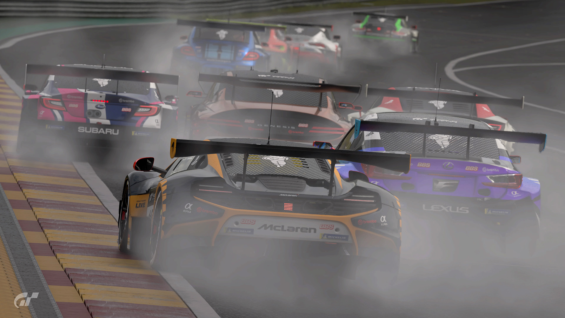 ローリングスタートで幕開けしたレースは、第1コーナーのスイーパーから始まり、タイトなヘアピンで各車が順位を競い合う展開となりました。ジェネシスはメルセデスAMGのルーカス・ボネリ選手(TGT_BONELLI)に衝突されコースオフし、8位まで順位を落とします。いっぽうで、ボネリはスバルをオーバーテイクして4位に浮上。ポルシェとトヨタが少しずつ差を広げる中、フォルクスワーゲン、メルセデスAMG、スバルの3台による3位争いが激化。ボネリは2ラップ目にポジションを一時的に獲得したものの、1ラップ目に起こしたジェネシスとの接触で2.0秒のペナルティを課せられ、結果として2つポジションを落としました。