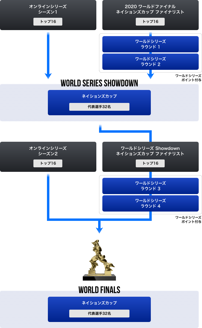 ワールドファイナル ネイションズカップは「2021ワールドシリーズ Showdown ネイションズカップ 上位16名」と「オンラインシリーズ ネイションズカップシーズン2の各地区の上位者16名」を合わせた、合計32名で争われます。
