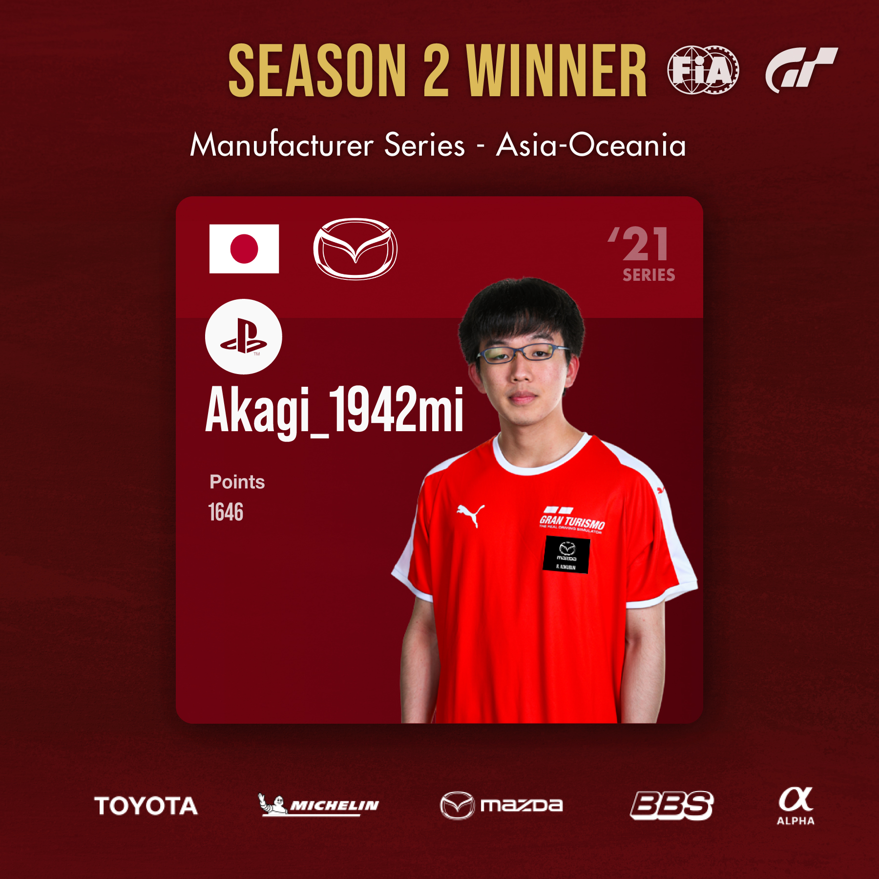 この瞬間に、シーズン2の首位の座をAkagi_1942mi選手(マツダ)が確定させ、シーズン1に続いて2連覇を達成しました。