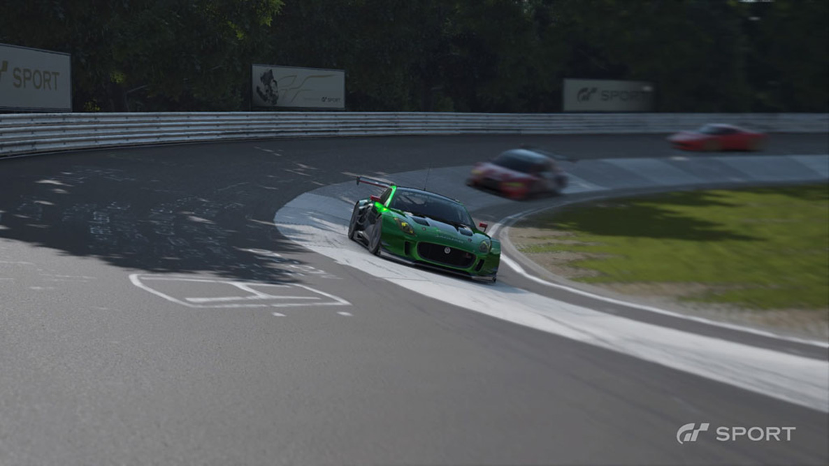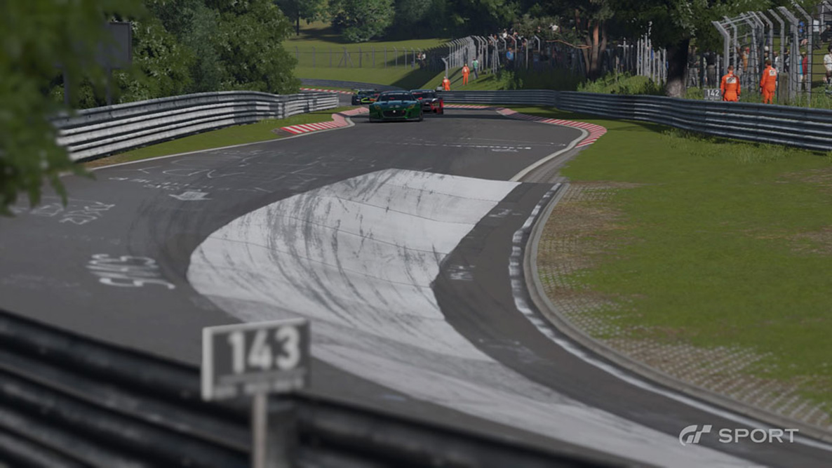 フルコースコーション及びバーチャルセーフティーカーが発動され、全車速度を制限され追い越し禁止措置が取られました。全プレイヤーが走り慣れているニュルブルクリンクということもあってなのか、その後もいたるところで攻めすぎた走りに起因するクラッシュが発生し、フルコースコーションとリスタートを繰り返されます。