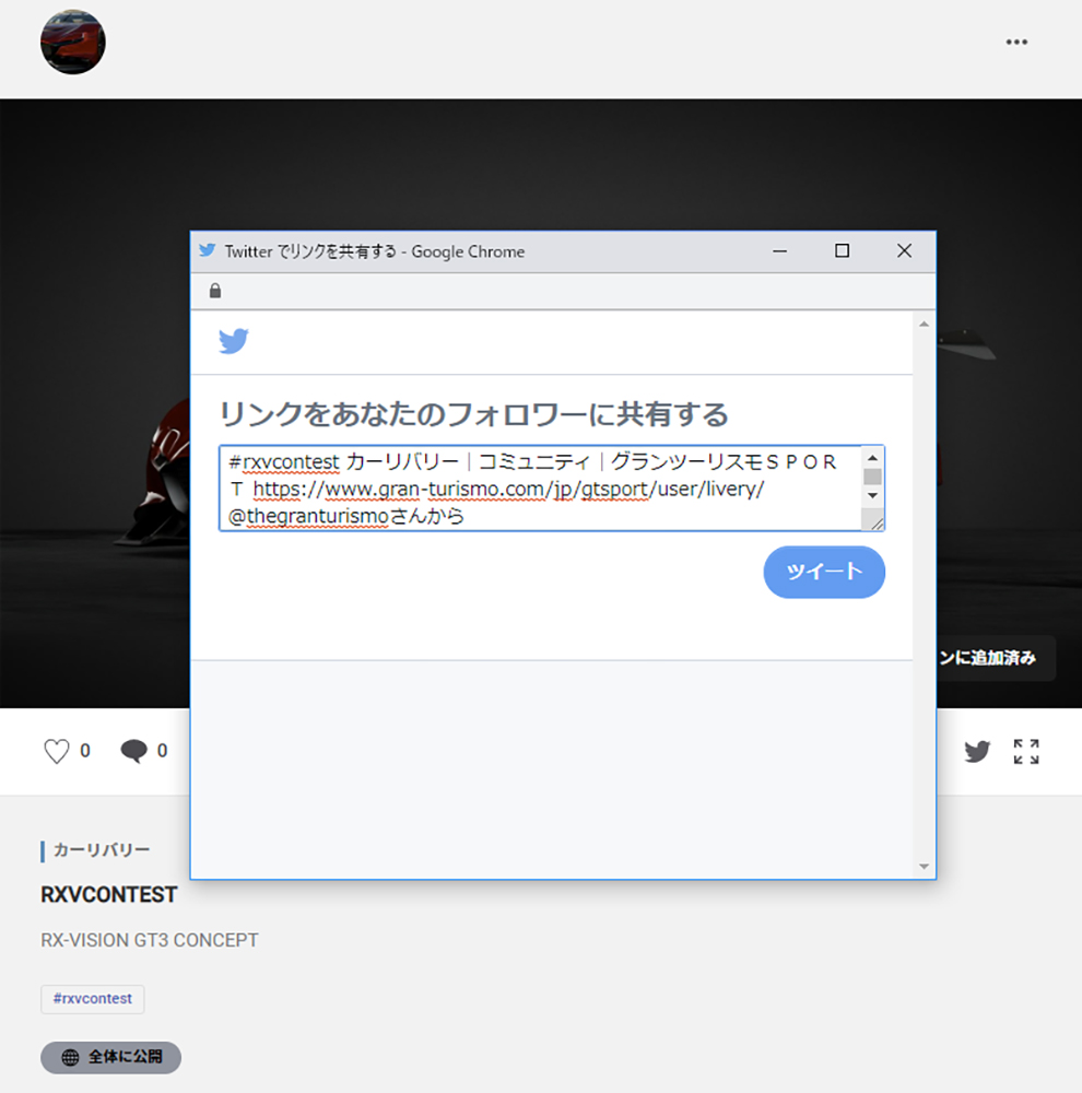 ・公開状態のTwitterアカウントのお持ちの方。完成したリバリーデザインをゲーム内とTwitterでシェアするとエントリー完了となります。