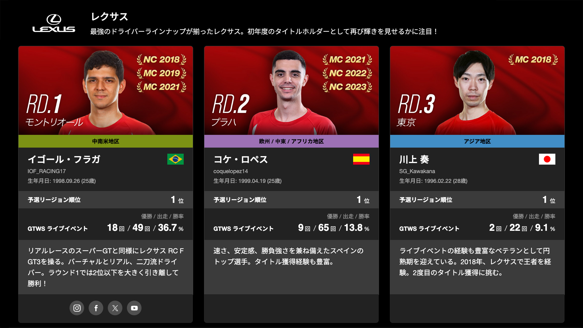特設サイトでは、今年のワールドシリーズ選抜選手・チームのプロフィール情報や、今大会のレース詳細、そして現地からのライブ配信スケジュール(公式YouTubeチャンネル「GRAN TURISMO TV」)を掲載。ワールドシリーズ視聴に役立つ観戦ガイドブックや最新のポイントランキングもご覧いただけます。
