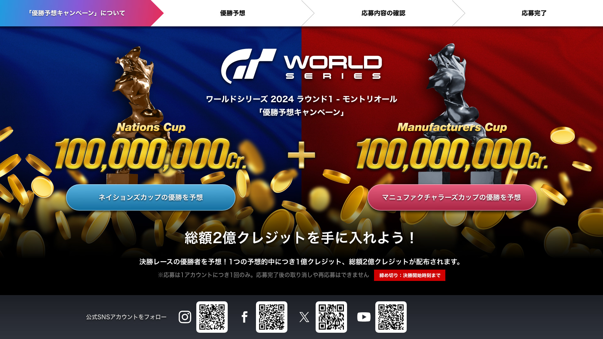 マニュファクチャラーズカップ、ネイションズカップの各決勝レースにおける優勝者を予想いただきます。的中で、それぞれ1億クレジットをプレゼント。両決勝レースともに的中された場合、獲得総額は2億クレジットに達します。