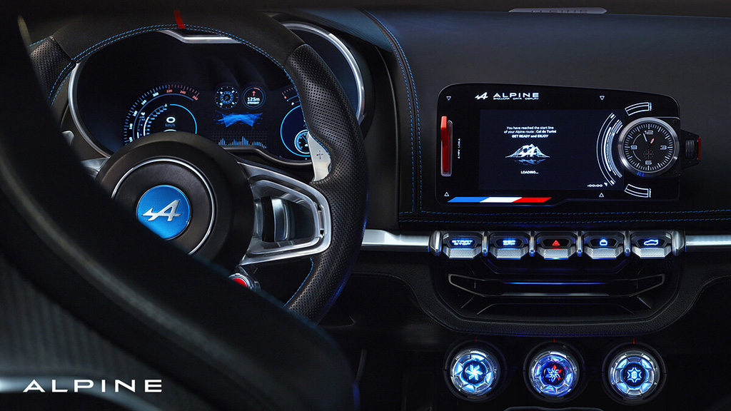 アルピーヌ ビジョンは、同社が2017年に市販するというスポーツカーのプロトタイプという位置付けです。とはいえその完成度は高く、このままディーラーに並べられそうなクオリティ。エクステリアは先述したA110を彷彿とさせるたたずまいで、フロントマスクやサイドパネルのキャラクターラインに往時の栄光を漂わせます。