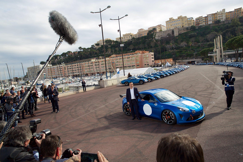 当日、F1モナコGPのコースともなるエルキュール港沿いの広場には、およそ90台ものアルピーヌA110が並び、自らの後継となるスポーツカーの登場に華を添えます。近くの特設テントで行われたアンヴェイルイベントでは、ルノーグループのカルロス・ゴーン会長兼CEO自らがヴェイルを外し、ホワイトにペイントされたアルピーヌ ビジョンを披露しました。