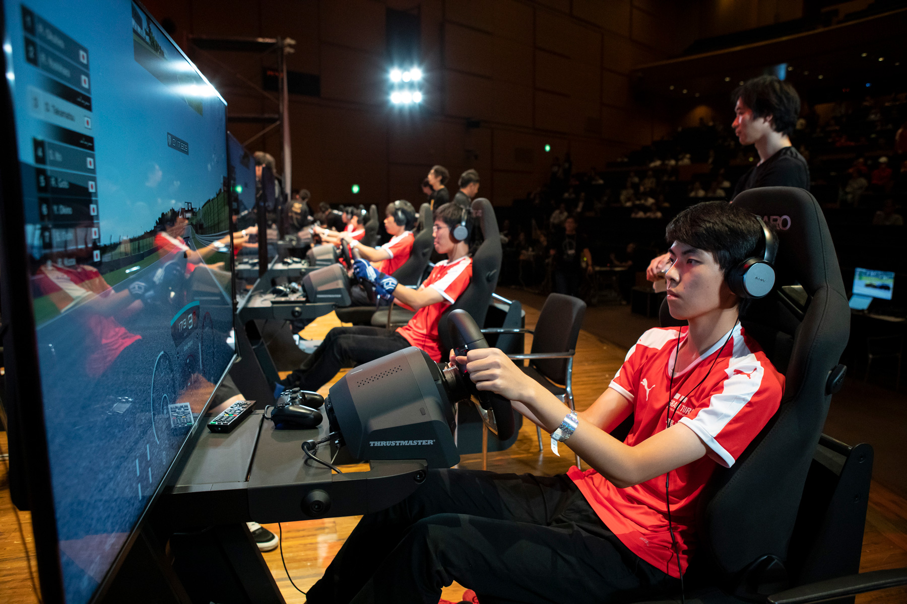 大半の選手がステアリングコントローラーを使用するなかで、あえてワイヤレスコントローラーを使用する選手、高校生中心のなかで健闘する中学生など、そのプレイスタイルと多様性はeスポーツならではで、大会初日、最初のセッションから会場は大いに沸きました。