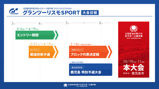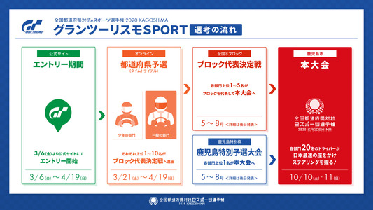 第75回国民体育大会「燃ゆる感動かごしま国体」の文化プログラムとして実施される「全国都道府県対抗eスポーツ選手権2020 KAGOSHIMA」(本大会・10月10日〜11日)において、『グランツーリスモSPORT』による競技部門が開催されます。このたび、かごしま国体での本大会に向けて各都道府県代表選手を選抜する47都道府県予選の詳細情報、およびブロック代表決定戦の概要が発表されました。