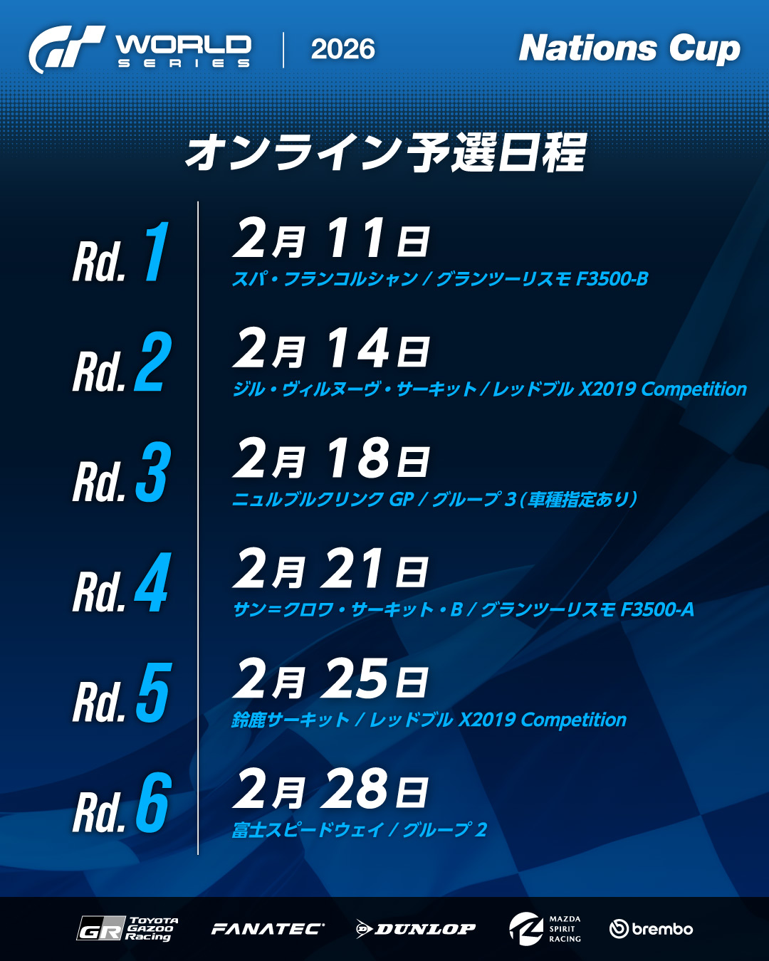 「グランツーリスモ ワールドシリーズ 2026 オンライン予選 – マニュファクチャラーズカップ」のコースや車種などの詳しい情報は、以下のニュースをご確認ください。ネイションズカップの各ラウンド情報については、追ってお知らせいたします。