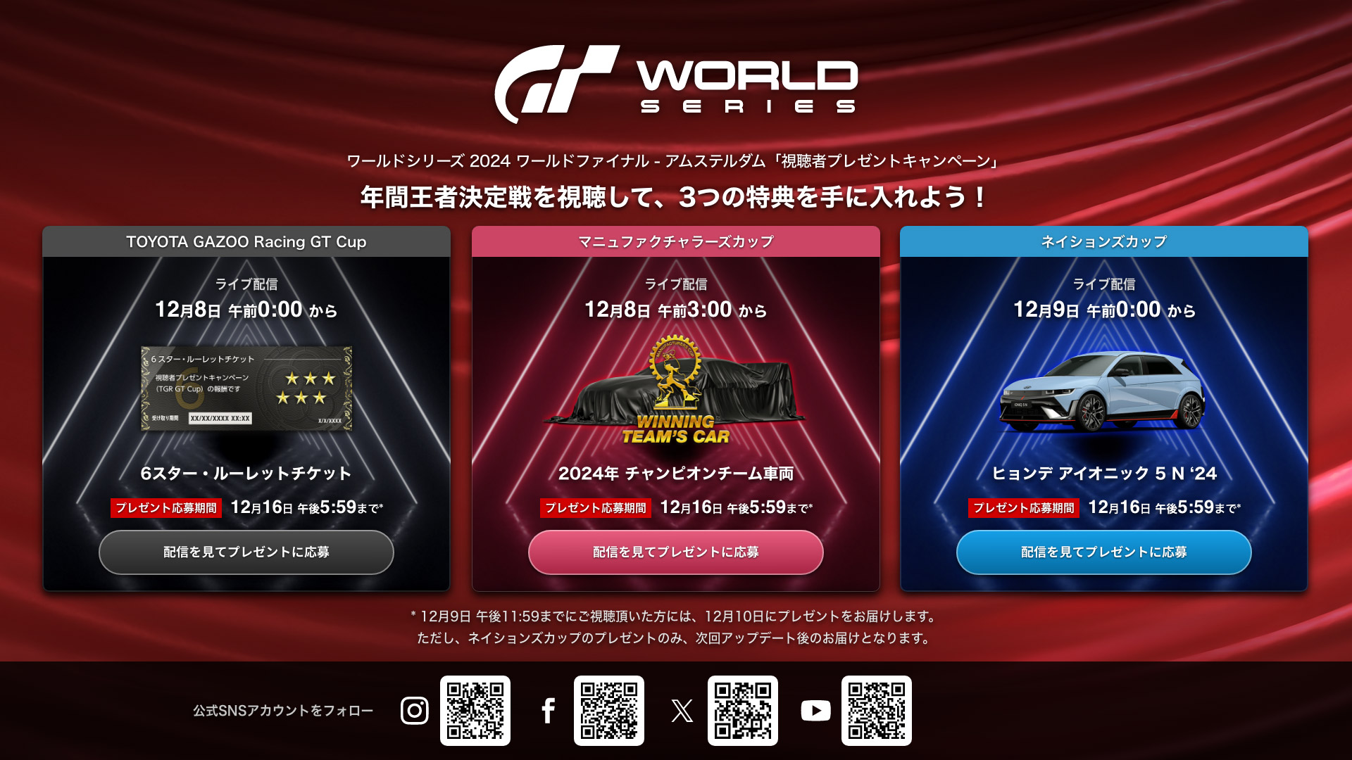 「グランツーリスモ ワールドシリーズ 2024 ワールドファイナル - アムステルダム」の詳しい情報は、特設サイトをご覧ください。
