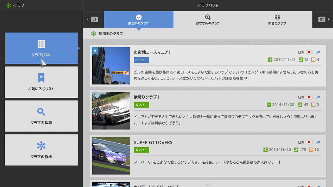 PlayStation®3専用ソフトウェア『グランツーリスモ6』の1.14アップデートを通じて新たに[コミュニティー]が登場しました。[コミュニティー]内ではプレイヤーのみなさんが自由に[クラブ]を結成して、オンラインラウンジに集まったり、クラブメンバー専用のレースイベントを開催して楽しむことができます。