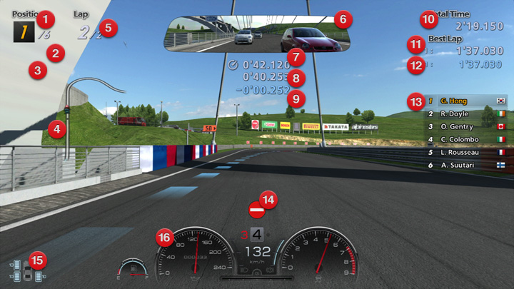 레이스 중의 화면에는 다음과 같은 정보를 표시하고 있습니다. 레이스의 종류나 시점에 따라 표시되는 내용은 달라집니다.