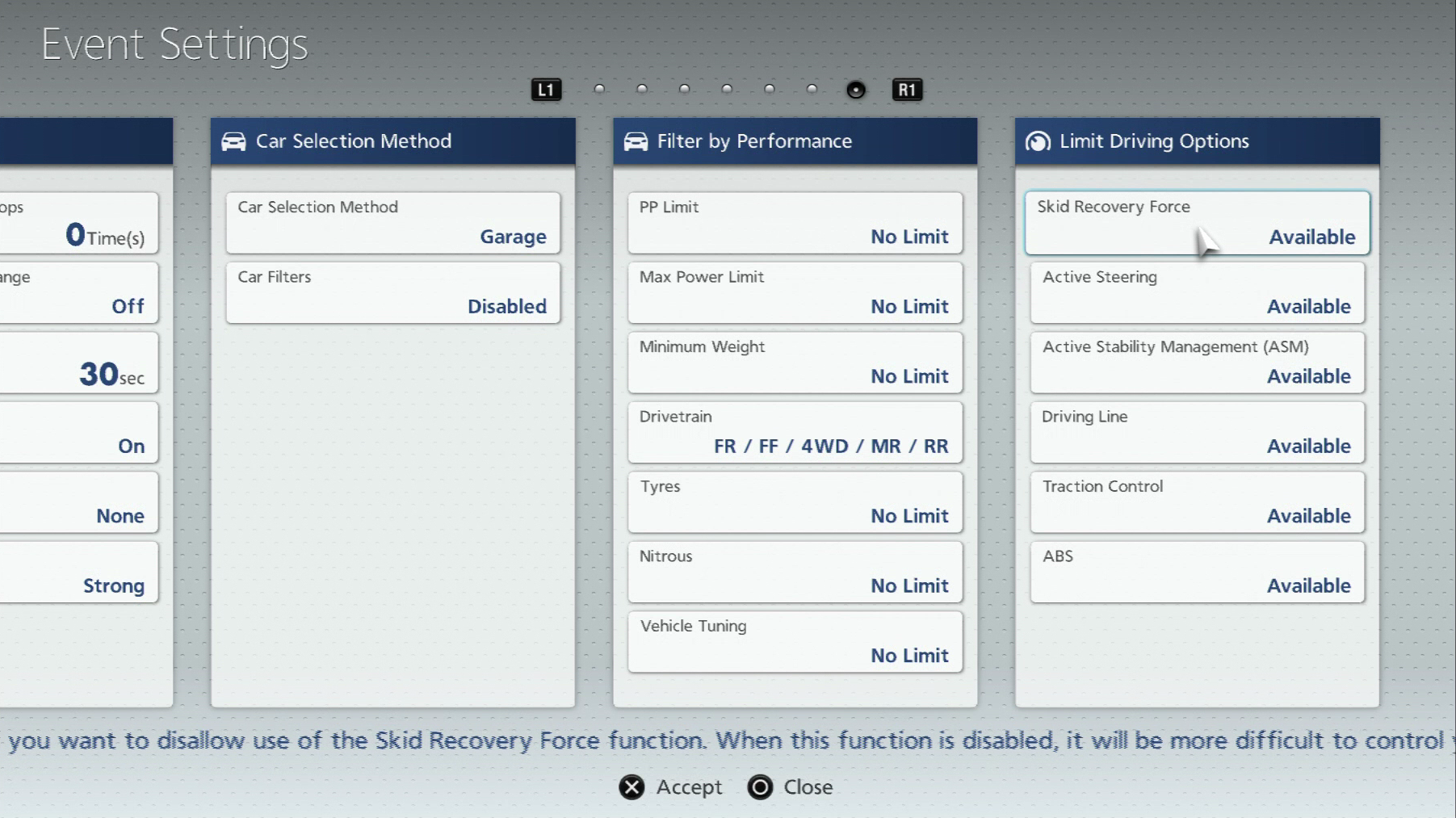 - 레이스 중에 장착하는 타이어에 제한을 설정합니다. 여기서 타이어를 지정해 두면 그 타이어보다 그립력이 높은 타이어는 장착할 수 없게 됩니다.