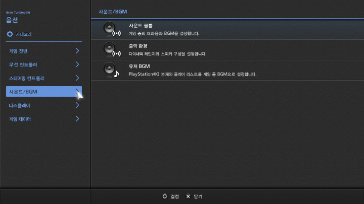 - PlayStation®3 본체의 플레이 리스트를 게임 중 BGM으로 설정합니다. 유저 BGM을 설정하면 PlayStation®3의 XMB™(크로스 미디어 바)의 음악 항목에 표시되는 음악을 메뉴나 레이스 도중, 슬라이드 쇼의 BGM으로 감상할 수 있습니다. 재생할 수 있는 코덱은 ATRAC / AAC / MP3 / WAV / WMA이며 샘플레이트는 48kHz / 44.1kHz / 22.05kHz입니다. 또한 온라인 레이스에서 유저 BGM을 사용하고자 할 때는 [음성 대화 품질]을 [무효]로 설정해 주십시오.