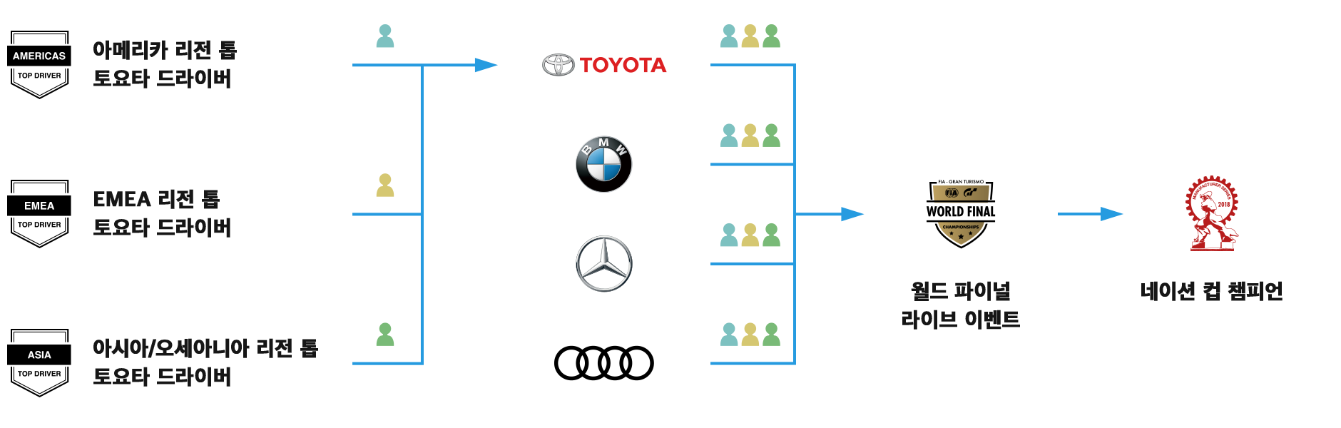 16 개의 매뉴팩처러의 톱 플레이어는 다음 스테이지로 진출합니다. 3개 리전의 각 16 매뉴팩처러 톱 플레이어 48명이 모여 "월드 파이널" 이벤트를 개최합니다. "매뉴팩처러 시리즈 월드 파이널"에서는 같은 매뉴팩처러의 드라이버 3인이 한 팀을 이루어 경쟁하는 형식입니다.