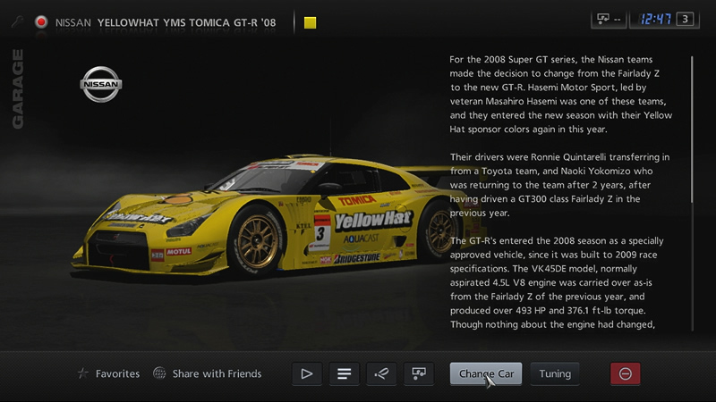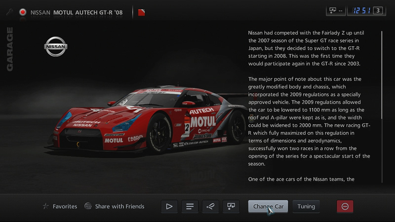 | 차량 | Nissan Calsonic IMPUL GT-R (SUPER GT) '08 타이어 제한: 레이싱/하드 (R1) * 대회 차량은 모든 참가자들이 대회에 참가할 시 임시적으로 차고에 로드됩니다. 이벤트에서 골드 트로피를 획득한 모든 참가자들은 레이스 후에 해당 차량을 (마이 홈에서) 선물로 받게 됩니다. |