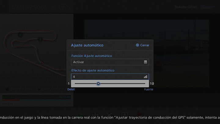 Si no has podido resolver las discrepancias entre la línea de conducción en el juego y la línea tomada en la carrera real con la función "Ajustar trayectoria de conducción del GPS" para mover la línea hacia arriba, abajo, derecha o izquierda, intenta activar la función de ajuste automático. Esto hará que las ruedas del auto se mantengan automáticamente en la superficie de la pista para impedir posibles errores.