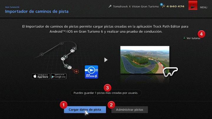 - El número restante de pistas creadas por el usuario que se pueden guardar se muestra aquí. En GT6, se puede guardar un máximo de 30 pistas creadas por el usuario. Las pistas creadas por tus amigos de la Comunidad también se incluyen en esta cifra.
