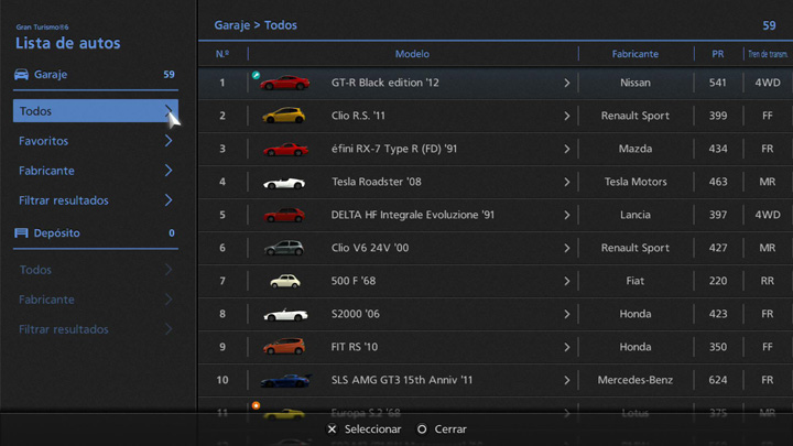 Tu Lista de autos se divide entre tu Garaje, donde se guardan los autos que conduces con más frecuencia, y tu Depósito, donde se almacena el resto de tu colección. Piensa en la frecuencia con la que conduces un auto antes de decidir si quieres almacenarlo. Puedes guardar hasta 500 autos en tu Garaje, mientras que en el Depósito hay suficiente espacio como para 9999 autos.