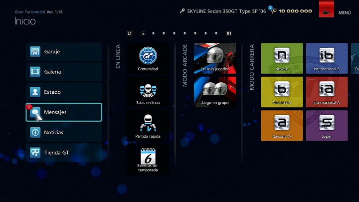 Para usar la función de mensajes, inicia sesión en PSN℠ antes de iniciar Gran Turismo 6. Para obtener más detalles sobre la función de mensajes, consulta la página "Mensajes" de la sección "Comunidad" de este manual.