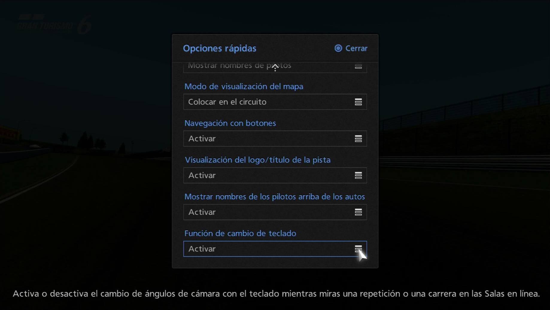Cuando mires una repetición o veas una carrera en modo Salas en línea, seleccionar la 'Cambio de cámara con teclado' en la barra de herramientas te permitirá cambiar la cámara y los datos que se muestran usando el teclado. Conecta un teclado USB o un dispositivo similar a tu sistema PlayStation®3 para poder usar esta función.