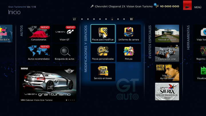 Si seleccionas "Modificaciones y Servicios", podrás comprar piezas para modificar y piezas personalizadas. También puedes realizarle mantenimiento a tu auto.