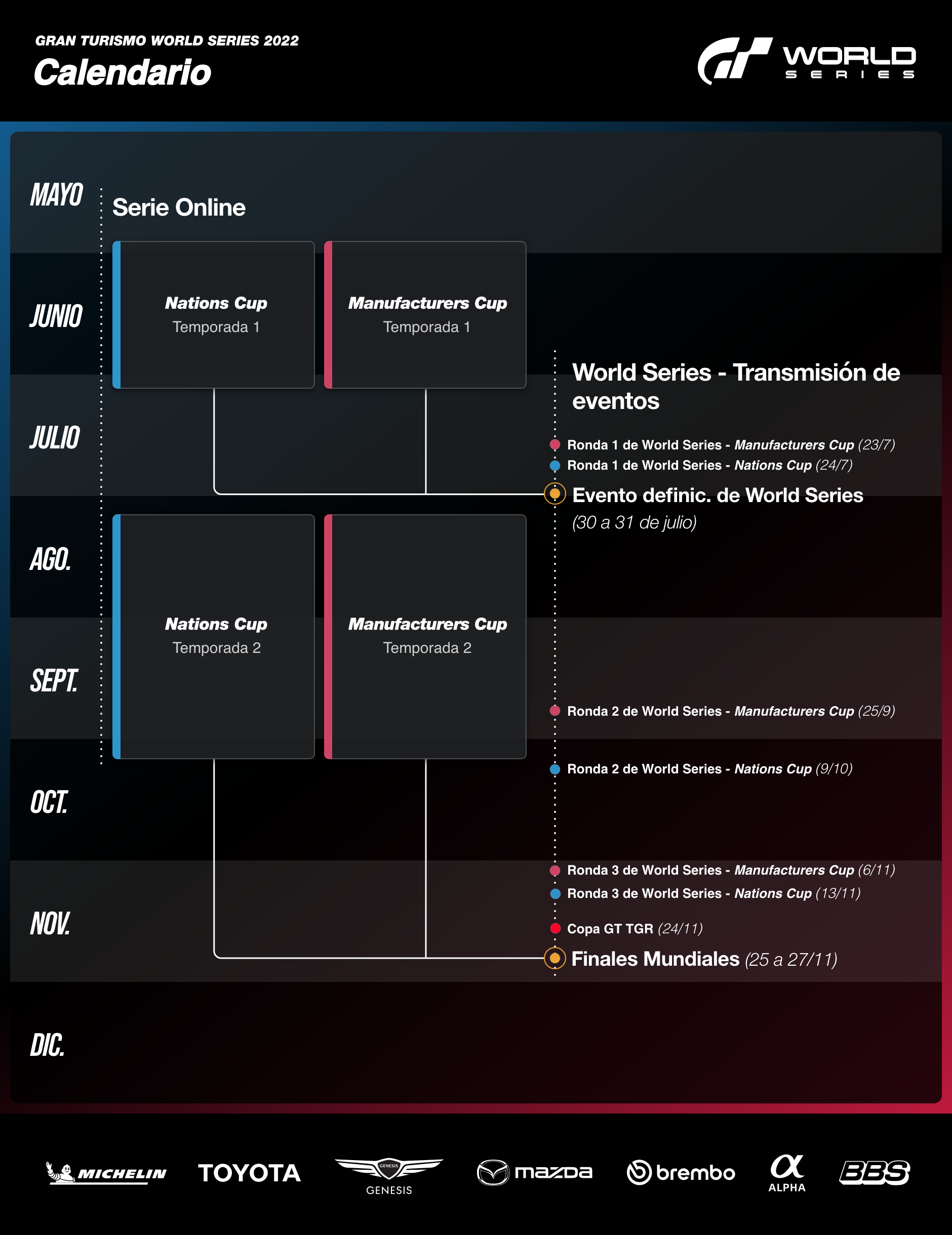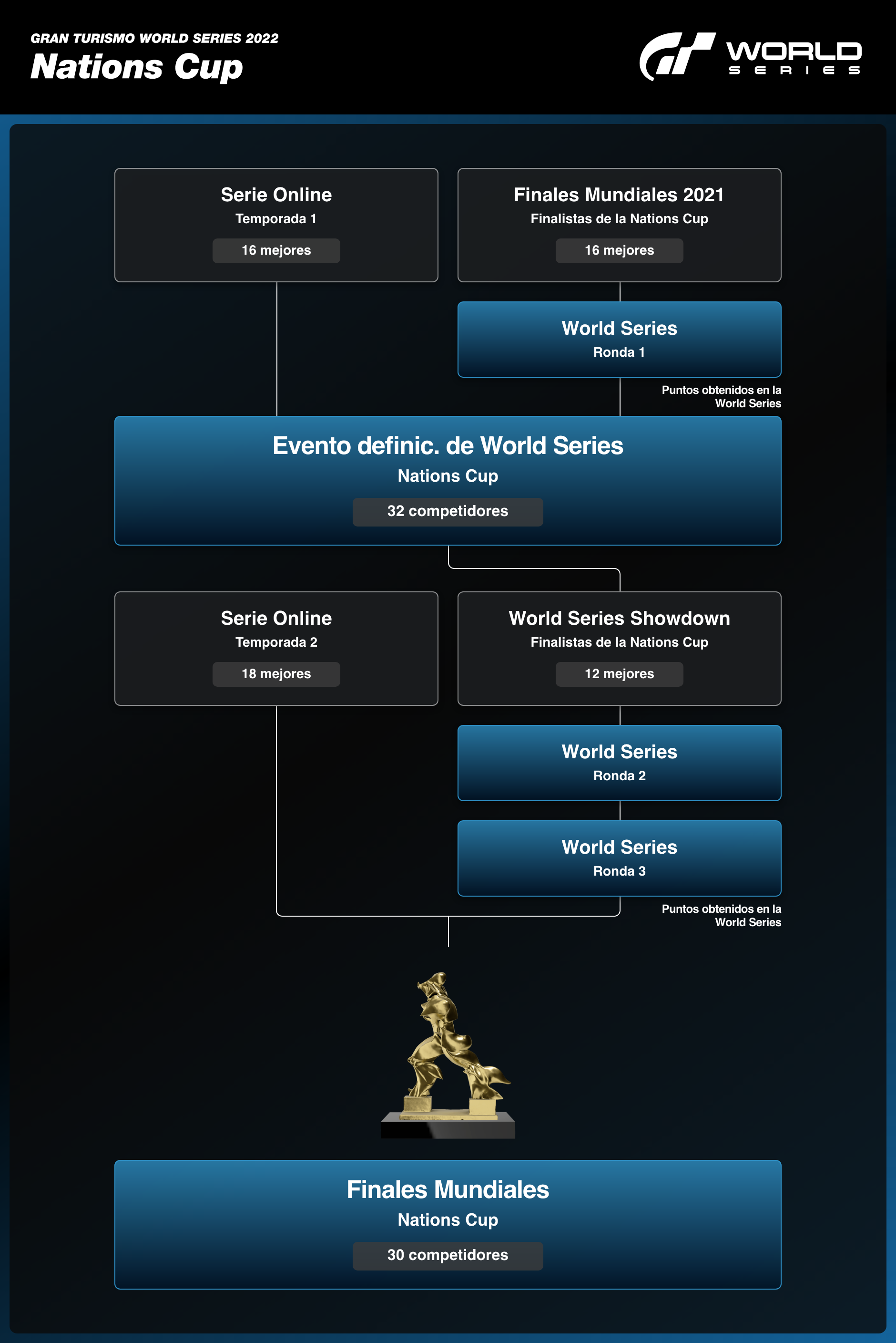 En las Finales Mundiales de la Nations Cup, competirán un total de 30 pilotos, 12 de los cuales clasificarán en el “Evento de definición de la Nations Cup de la World Series 2022”, y los restantes 18 clasificarán de cada región en la Temporada 2 de la Serie Online 2022 de la Nations Cup de la Liga GT1.