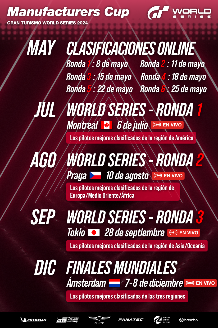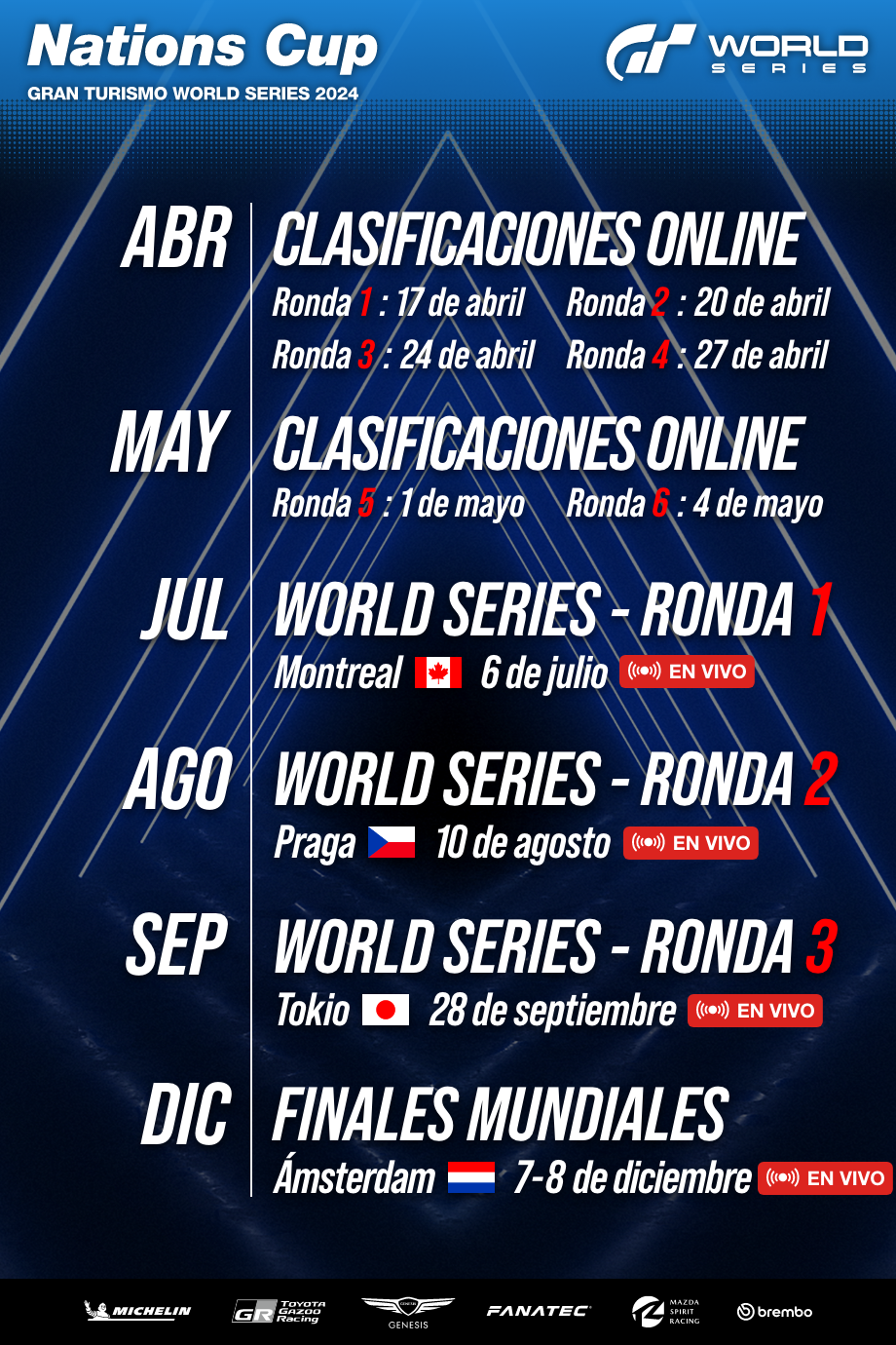 - (Las fechas de transmisión reales pueden cambiar. Las fechas reales de las carreras se notificarán directamente a los pilotos).