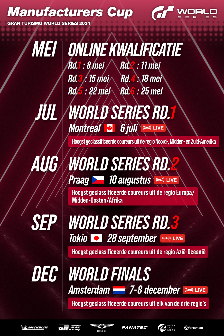 Er gaan in totaal 12 fabrikanten naar de World Series, waaronder officiële partnerfabrikanten voor de 2024-serie (zie hieronder) en de beste fabrikanten van het internationale fabrikantklassement van de GT1 League, dat berekend wordt na afloop van de Online Kwalificatie.