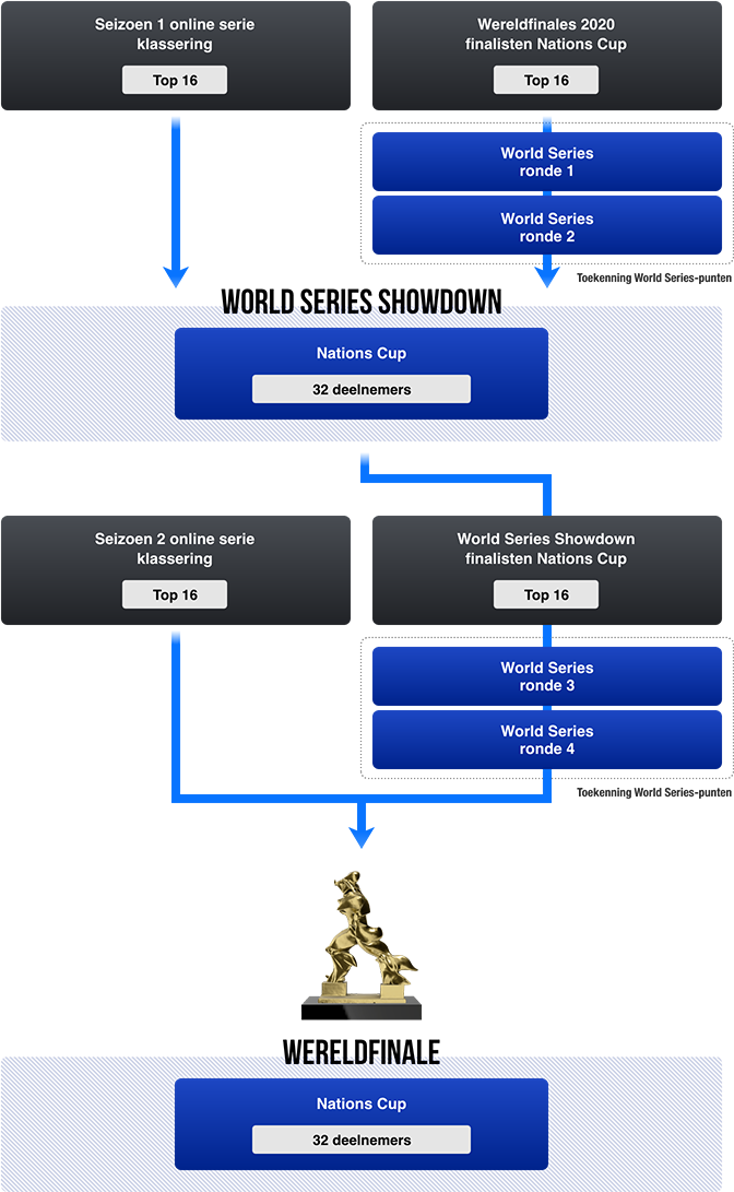 De World Series-punten worden toegevoegd als startpunten in het klassement van de wereldfinales.Puntenverdelingstabel