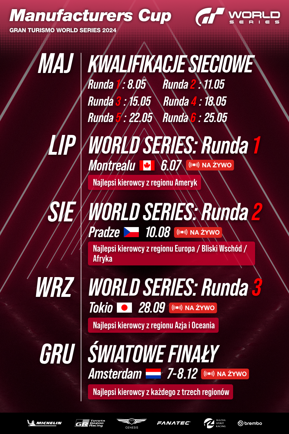 - (Daty transmisji mogą ulec zmianie. Kierowcy zostaną bezpośrednio powiadomieni o dokładnym czasie rozpoczęcia wyścigów).