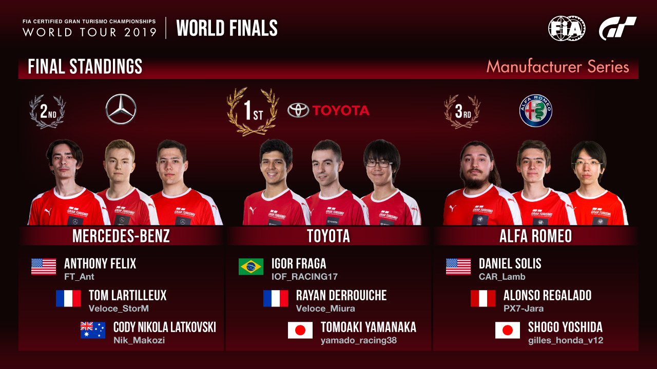 Przyznano premie zwycięstwa za Nations Cup i Manufacturer Series w ramach światowych finałów FIA Gran Turismo Championships 2019.