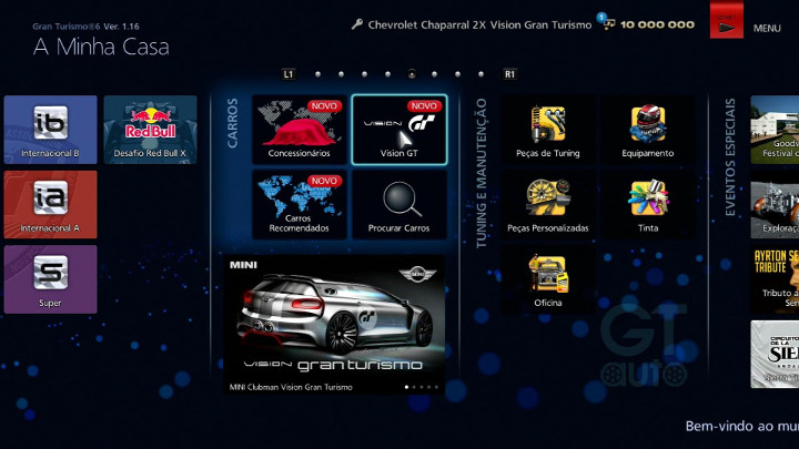 Liga-te à PlayStation®Network e os carros serão gradualmente revelados, através das atualizações online do Gran Turismo 6. Seleciona 'Vision GT', no ecrã 'A Minha Casa', para reclamares estes carros. Seleciona um carro e serás levado para o Ecrã Expositor, onde podes escolher uma cor para o carro e ver vídeos e esboços.