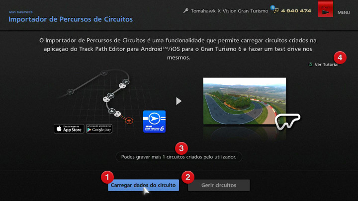 O Importador de Percursos de Circuitos é a ferramenta usada para carregar os circuitos criados no Track Path Editor e guardá-los como circuitos criados pelos utilizadores no Gran Turismo 6. Precisas de iniciar sessão na PlayStation™Network para usar esta ferramenta.