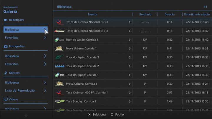 A música do Gran Turismo 6 é gerida a partir da 'Biblioteca'. Seleciona 'Biblioteca' e será exibida uma lista de músicas do lado direito do ecrã. Podes reproduzir cada uma delas premindo o botão localizado à direita do nome da canção. Prime o Botão SELECT e podes escolher uma das seguintes opções: 'Adicionar à música da Corrida', 'Adicionar à música do Menu' ou 'Adicionar à música da Ap. de Diapositivos'.