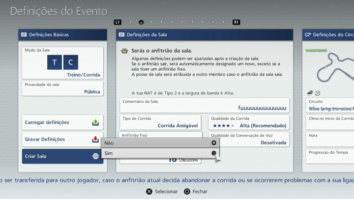 No modo Salas Online, o jogador que cria a sala passa a ser o proprietário da sala. Quando ajustas as definições da sala, podes escolher entre fixar ou não a propriedade da sala. Consoante a largura de banda e tipo de NAT do proprietário, poderás escolher entre ativar ou desativar a propriedade fixa da sala. Consulta as informações seguintes para mais detalhes. Para detalhes mais específicos sobre largura de banda ou tipo de NAT, consulta a página 'Para apreciares uma corrida online sem problemas'.