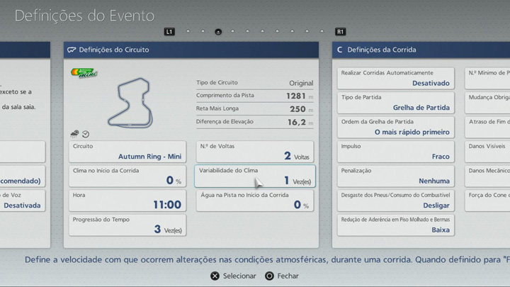 - Define a velocidade a que as condições meteorológicas mudam ao longo de uma corrida. Se for definido como "Fixo", não existirão mudanças. Os valores mais elevados resultam em modificações mais rápidas das condições meteorológicas.