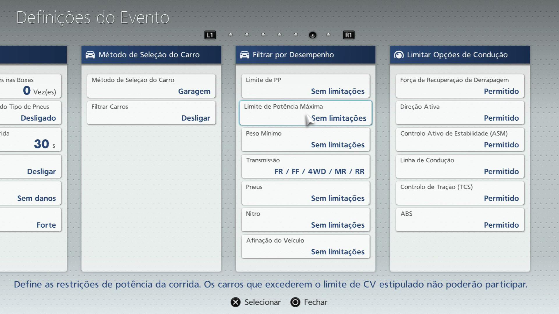 - Define um limite de Pontos de Performance. Os carros que excederem esse limite não poderão participar.