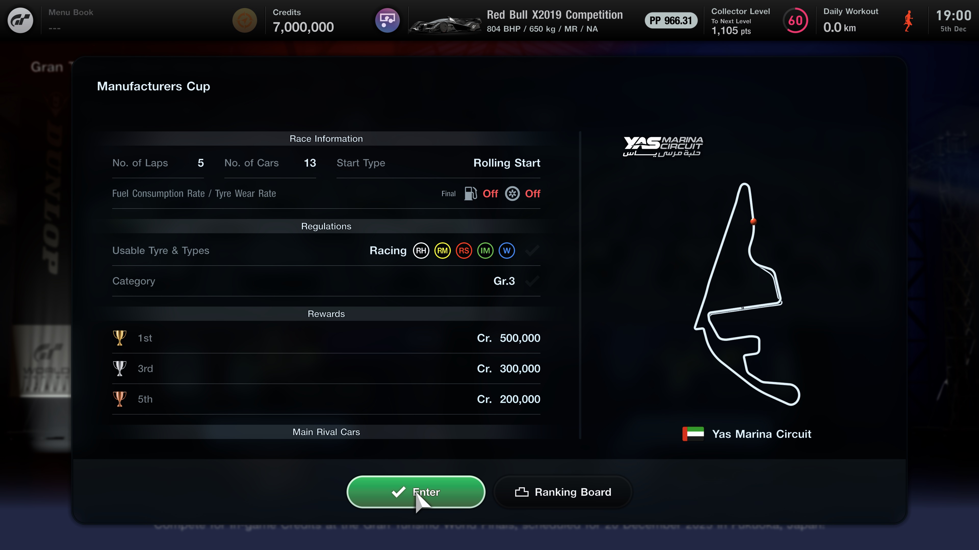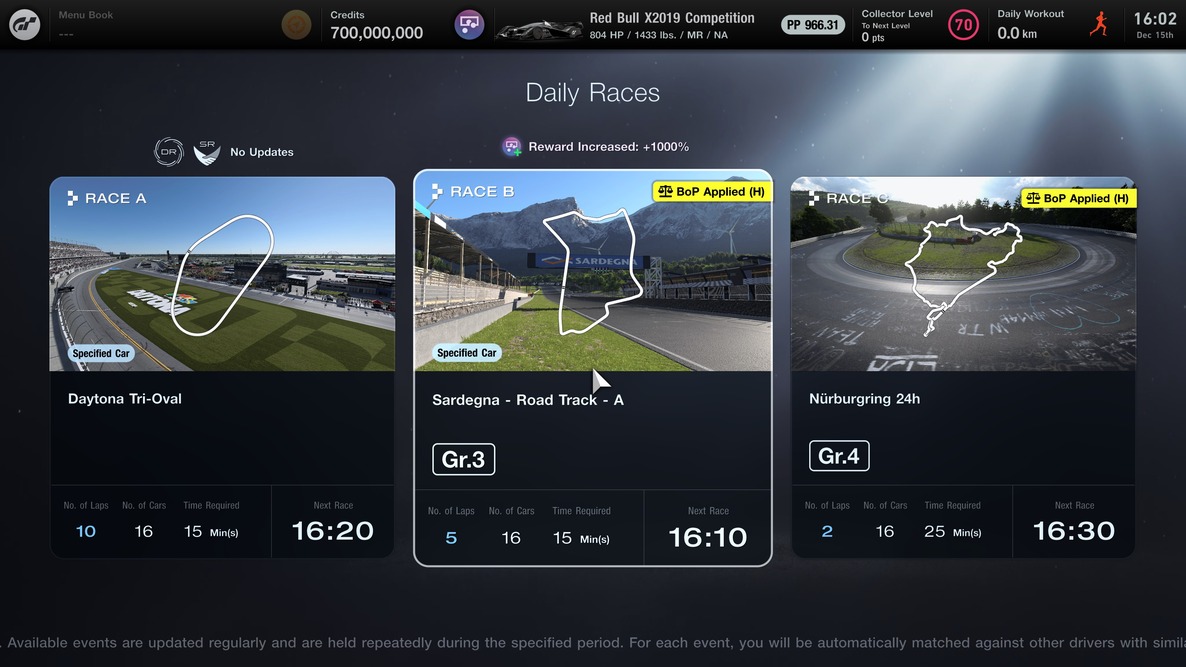 A partir de segunda-feira, 15 de dezembro, a Corrida Diária B recriará a Corrida 3 da Manufacturers Cup. Nesta corrida, o número de créditos no jogo recebidos por terminar a prova também é bastante aumentado. Este evento pode ser encontrado nas Corridas Diárias do pavilhão Sport.