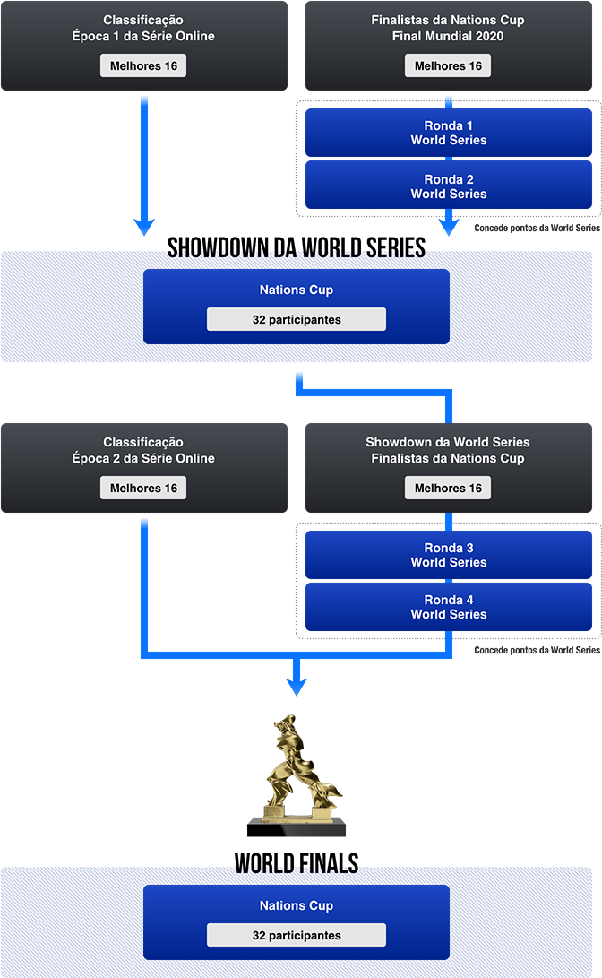 Na Final Mundial da Nations Cup competirão um total de 32 participantes, 16 dos quais oriundos da Nations Cup do Showdown da World Series 2021 e 16 oriundos da Época 2 da Série Online 2021 da Nations Cup.