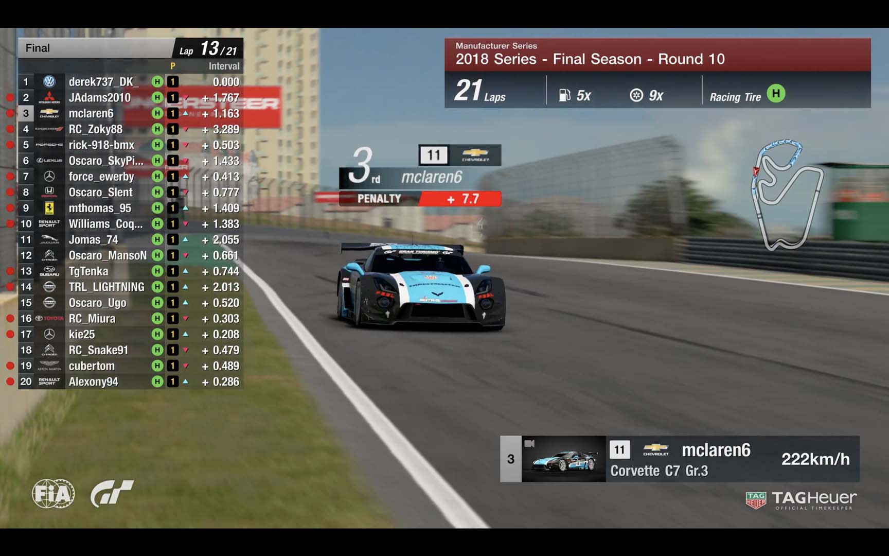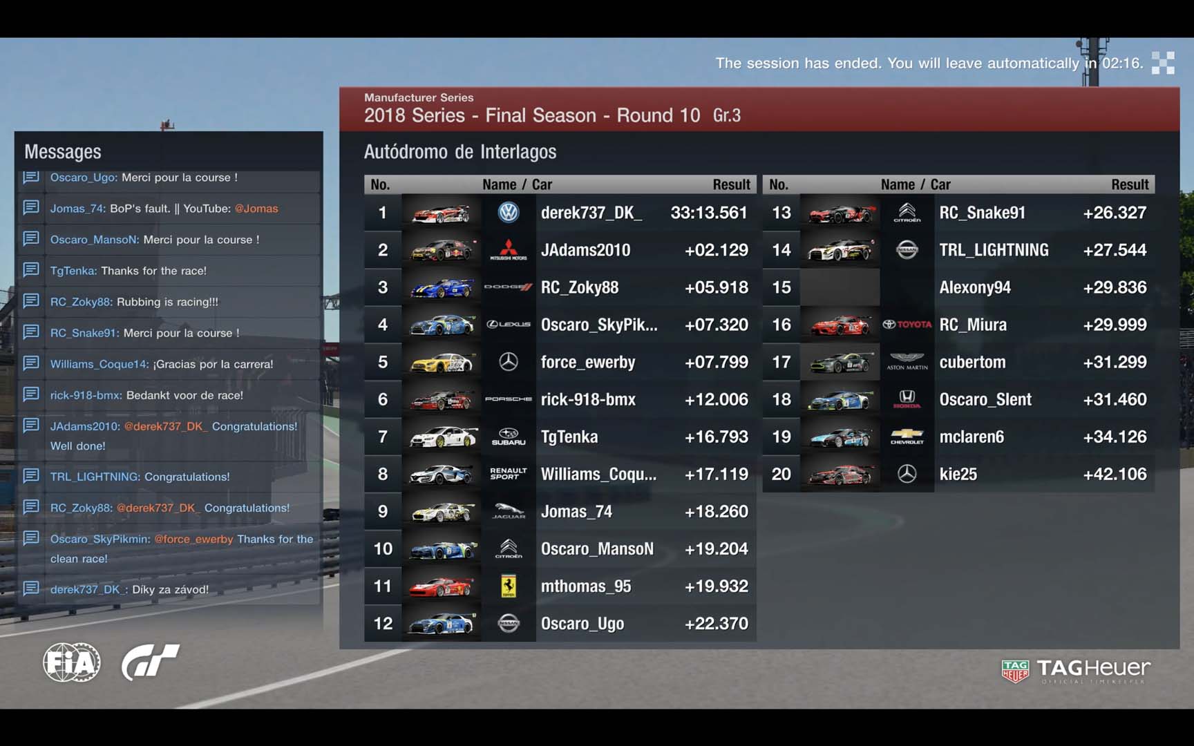 Com tudo o que se passava lá atrás, a fantástica prestação de derek737_DK_ (Volkswagen) passou quase despercebida e o seu GTI VGT cruzou a meta mais de dois segundos à frente do piloto seguinte. Os esforços do piloto checo foram bem recompensados com 8621 pontos. Caso a Volkswagen se qualifique para a Manufacturer Series, derek737_DK_ estará seguramente presente em sua representação.